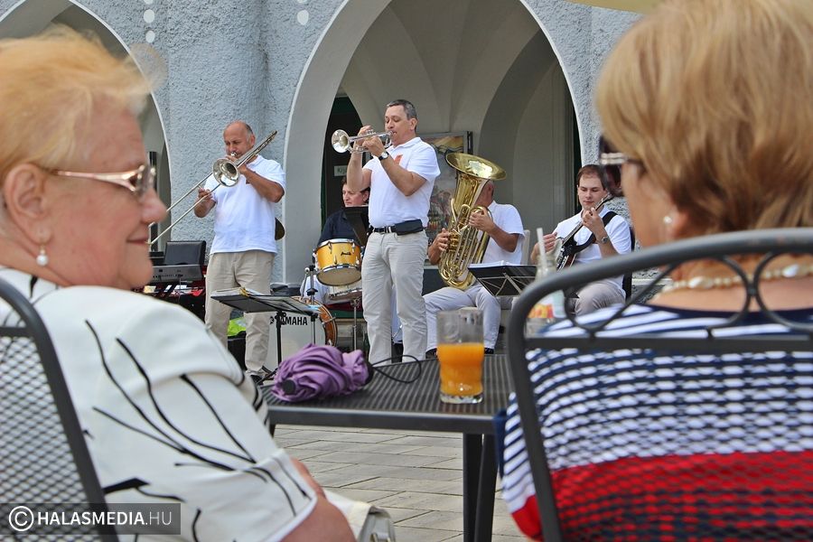 A kellemes délutáni napsütésben sokan foglaltak helyet a zenepavilonnál lévő padokon vagy éppen a főtéri vendéglátóhelyek teraszain, hogy meghallgassák a Bohém Ragtime Jazz Band koncertjét.