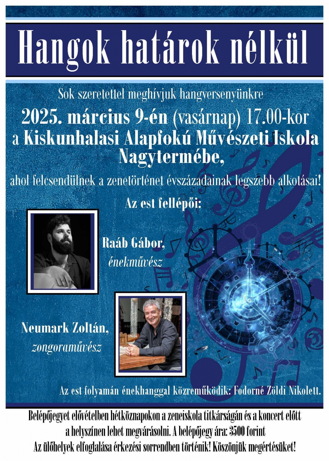 Egy különleges koncert, ahol a zene minden határt átlép. A kiskunhalasi Raáb Gábor énekművész hosszú évek kihagyása után, ismét szülővárosában ad koncertet. Az este során zongorakísérettel csendülnek fel a klasszikus zene gyöngyszemei. Megható népdal-feldolgozások, érzelmekkel teli opera- és operettáriák, valamint könnyedebb, cross-over dallamok teszik teljessé ezt a varázslatos utazást különböző korszakokon és stílusokon át.