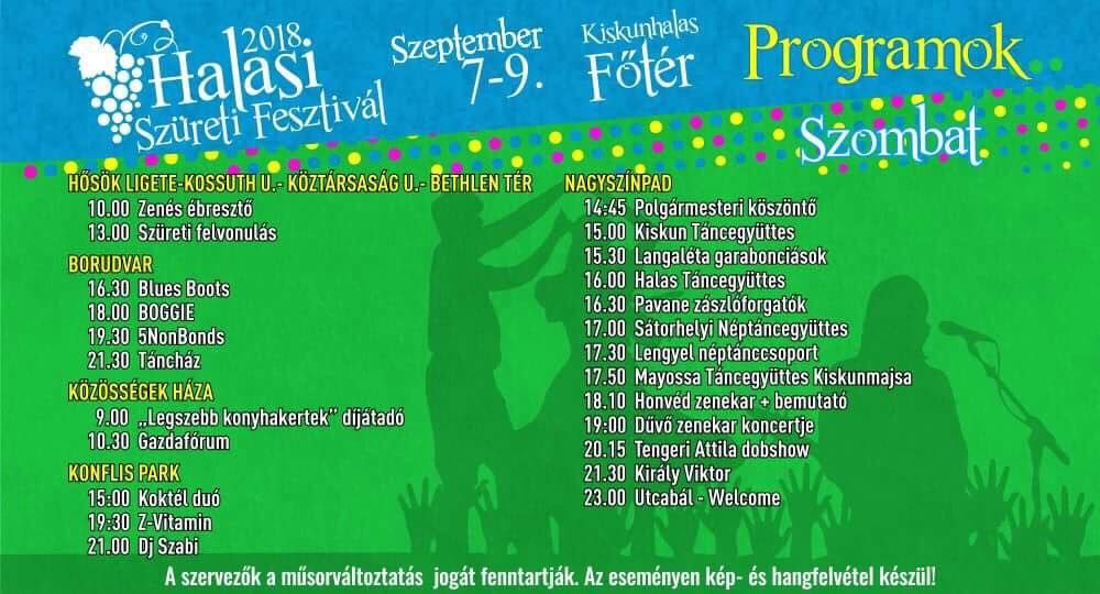 Szeptember 7-9. között rendezzük meg az idei Halasi Szüreti Fesztivált. Örömmel jelenthetjük, elkészült a háromnapos eseménysorozat részletes programja. Igyekeztünk úgy összeállítani a műsorszámokat, hogy minden korosztály megtalálja a neki kedves szórakozási lehetőséget. Jó böngészést és persze szeretettel várunk mindenkit!
