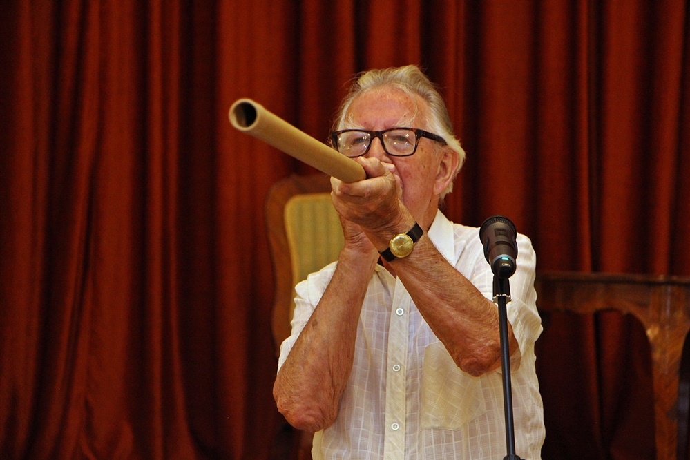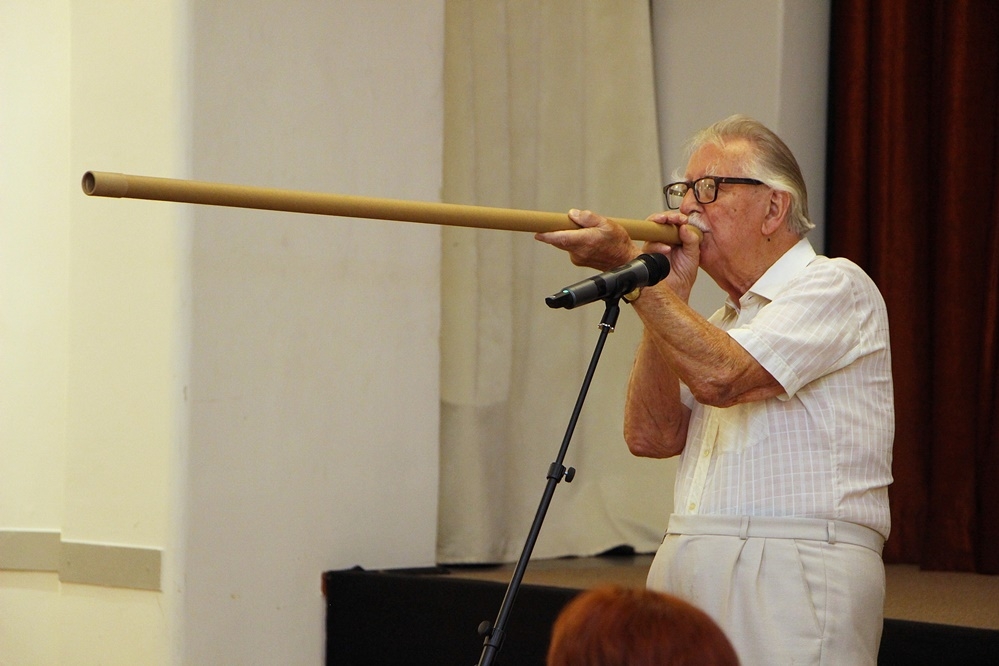 Mielőtt a jelenlévők körbenézhették volna az alkotásokat, több meglepetés is történt. Baráth József felidézte gyermekkora egyik meghatározó, játékos pillanatát, amikor a porszívócsőbe trombitált. Ezúttal egy kartonhengert szólaltatott meg a közönség legnagyobb örömére.