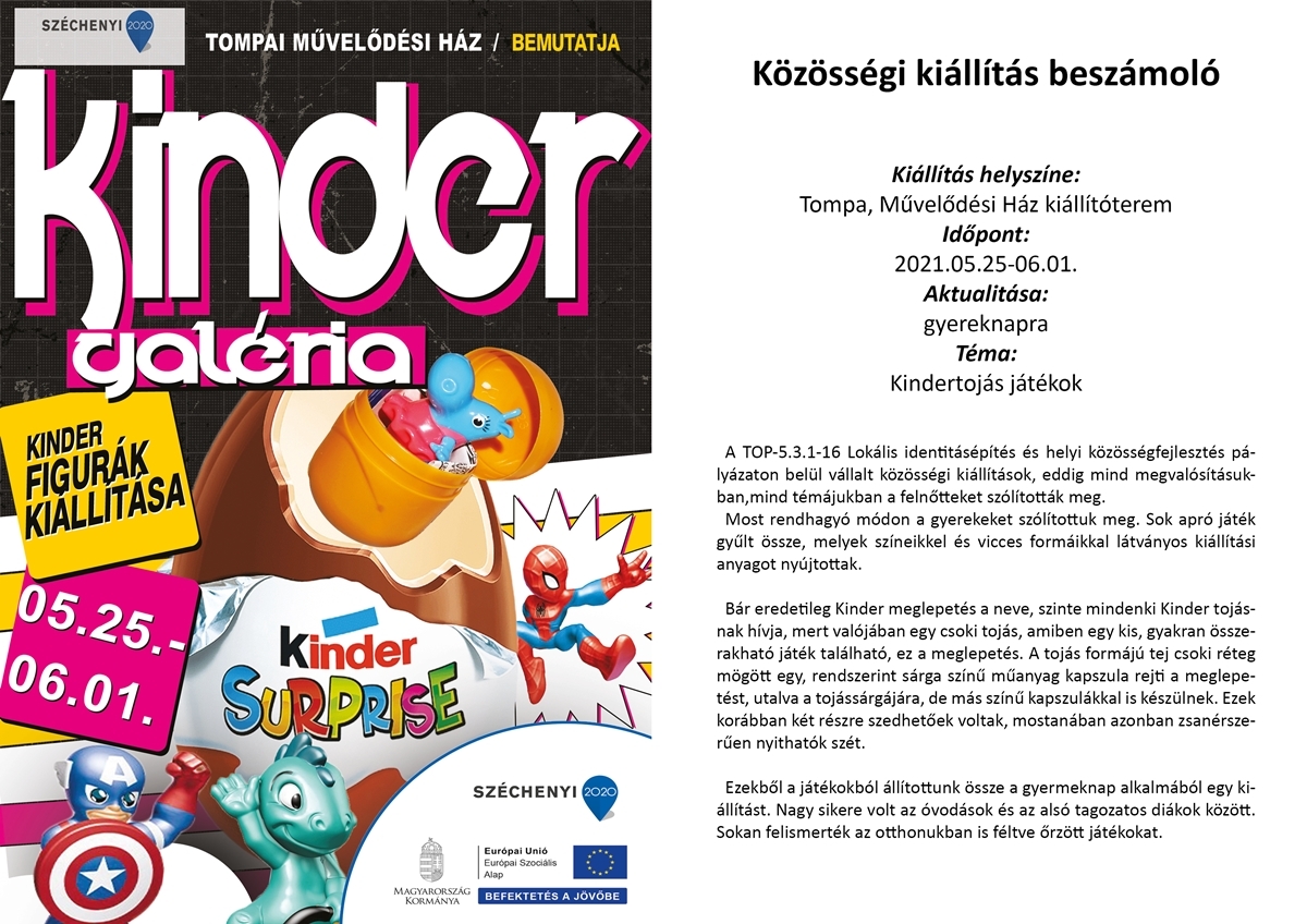 Bár eredetileg Kinder meglepetés a neve, szinte mindenki Kinder tojásnak hívja, mert valójában egy csokitojás, amiben egy kis, gyakran összerakható játék található, ez a meglepetés. A tojás formájú tejcsoki réteg mögött egy, rendszerint sárga színű műanyag kapszula rejti a meglepetést, utalva a tojássárgájára. Ezekből a játékokból állítanak össze a gyermeknap alkalmából egy kiállítást. A tárlat 2021.05.25. és 06.01. között lesz megtekinthető a Művelődési Házban.
