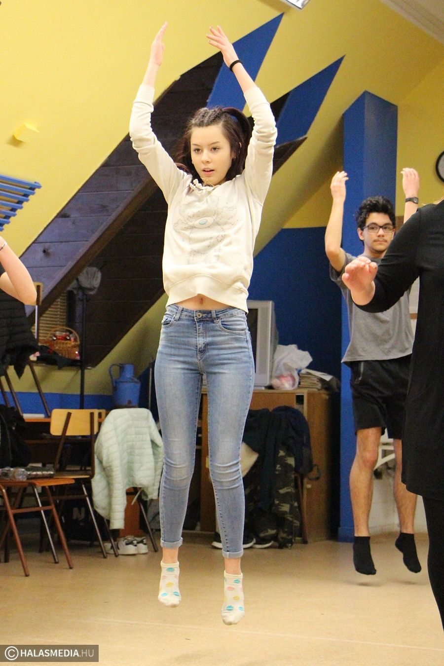 - A Czagányné Pásztor Anikó által rendezett Dzsungel könyvében játszottam, így ennek a próbateremnek a légköre nem ismeretlen számomra, bár mióta legutóbb itt jártam, nagyon megváltozott az épület. Igaz, hogy a jelenlegi csapat főként prózai, kevés mozgást igénylő darabokat szokott előadni, de szerintem a mostani táncóra ezeknél a színpadi szerepléseknél is sokat segíthet. Eleinte kissé visszafogottak voltak a diákok, de aztán hamar feloldódott mindenki, így remek hangulatban tudunk dolgozni. Egy koreográfiát szinte már meg is tanultunk, hamarosan nekikezdünk a második feladatnak – avatta be olvasóinkat a részletekbe Kíra.