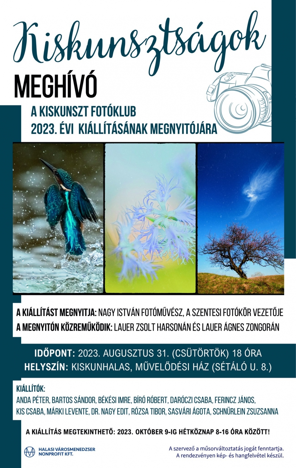 A Kiskunszt Fotóklub tárlatának alkotói: Anda Péter, Bartos Sándor, Békési Imre, Bíró Róbert, Daróczi Csaba, Ferincz János, Kis Csaba, Márki Levente, Dr. Nagy Edit, Rózsa Tibor, Sasvári Ágota, Schnürlein Zsuzsanna. A kiállítás 2023. október 9-ig lesz megtekinthető hétköznapokon 8 és 16 óra között. A tárlatra ingyenes a belépés.