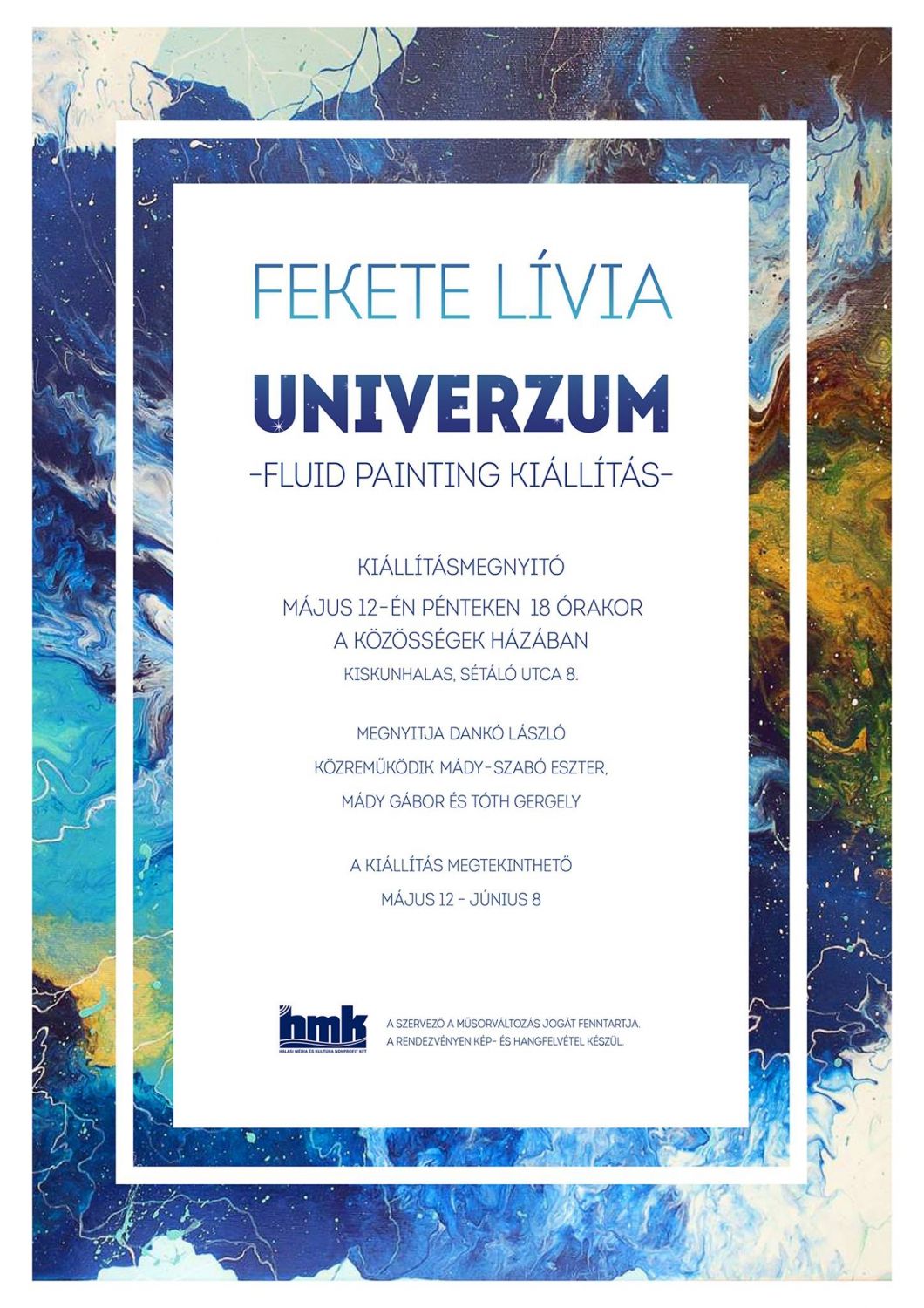 Május 12-én pénteken 18 órakor a Közösségek Házában nyílik Fekete Lívia Univerzum című kiállítása. Élő zenés, audiovizuális élményben lesz része azoknak a művészetre érzékeny látogatóknak, akik eljönnek erre a megnyitóra