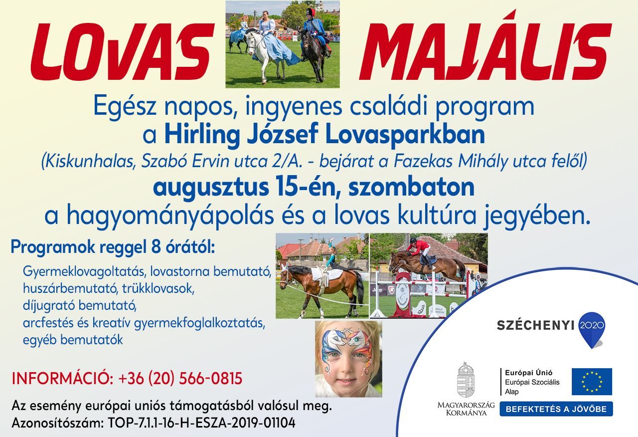 Nagyszabású, sokszínű lovas és kulturális hagyományokat felelevenítő programot szerveznek Kiskunhalason a Hirling József Lovasparkban szombaton. A komplex helyi kulturális értékeket bemutató egynapos rendezvényre 2020. augusztus 15-én egész nap várják a látogatókat a rendezők, a lovasparkba ingyenes a belépés.