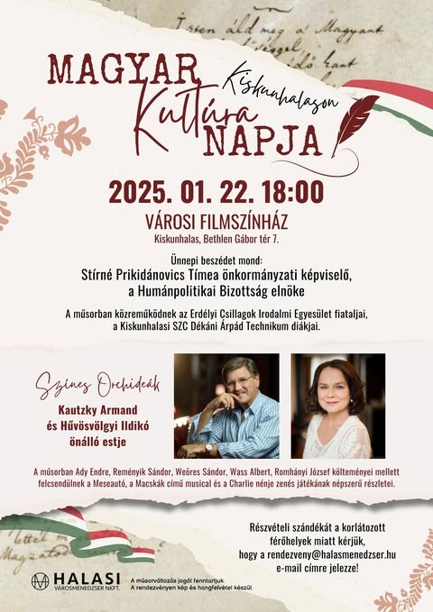 Neves művészekkel ünnepli Kiskunhalas a magyar kultúra napját. Kautzky Armand és Hűvösvölgyi Ildikó, a Színes Orchideák című előadásukban keltik életre a magyar kultúra szépségeit a Halasi Városmenedzser Nonprofit Kft. szervezésében.