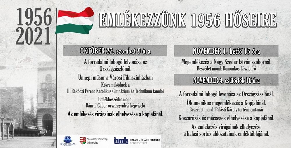 Kiskunhalas készül az 1956-os megemlékezésekre. Október 23-án 9 órakor az Országzászló emlékműnél a forradalmi lobogó felvonásával kezdődik a program. Ünnepi műsorral a II. Rákóczi Ferenc Katolikus Gimnázium és Technikum diákjai készülnek. Emlékbeszédet Bányai Gábor országgyűlési képviselő mond. November elsején Nagy Szeder István szobránál lesz megemlékezés. November 4-én a Kopjafánál és a halasi sortűz áldozatainak emléktáblájánál zárul a programsorozat.