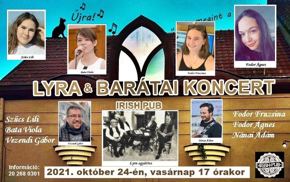 Lyra és barátai koncert lesz 24-én vasárnap 17 órakor. Helyszín az Irish Pub. A Lyra együttes mellett fellép Bata Viola, Fodor Ágnes, Fodor Fruzsina, Nánai Ádám, Szűcs Lili és Vezendi Gábor.