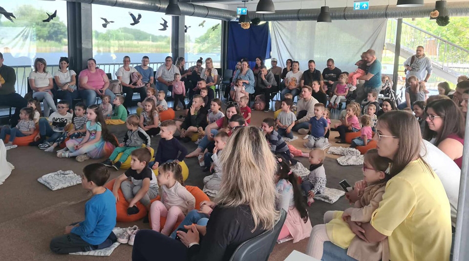 A nagy érdeklődés miatt két csoport is megtöltötte a Csetényi Élménypark csónakházának auláját, ahol Bartos Erika írónő prezentáció kíséretében mesélt a kicsiknek Bogyó és Babóca történeteket, miközben mókás fejtörőket adott a gyermekeknek. A kicsik aktivitását közös énekléssel fokozta az írónő. Az eseményen dedikálásra is lehetősége nyílt a magukkal könyvet hozók részére, amellyel le is zárult a sikeres vándorkiállítás.