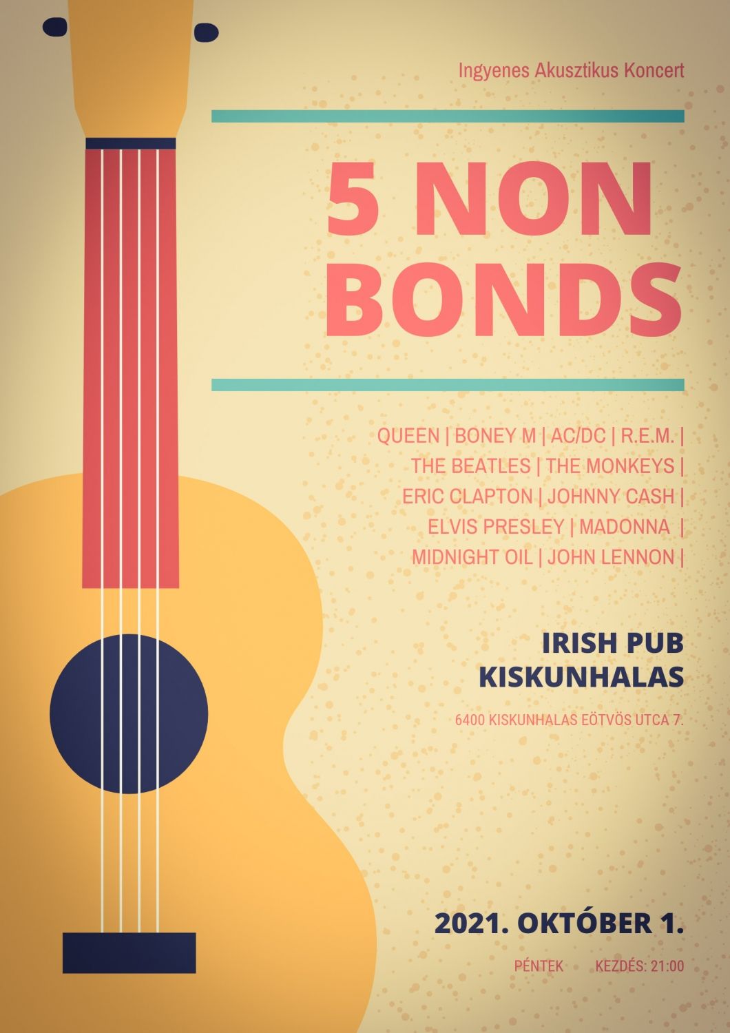 Szintén a Zene világnapján ingyenes akusztikus koncert lesz az Irish Pubban. 21 órától kezdődik a 5 Non Bonds zenekar könnyed hangulatú műsora. A repertoárban többek között Queen, Elvis Presley és Boney M dalok is szerepelnek.