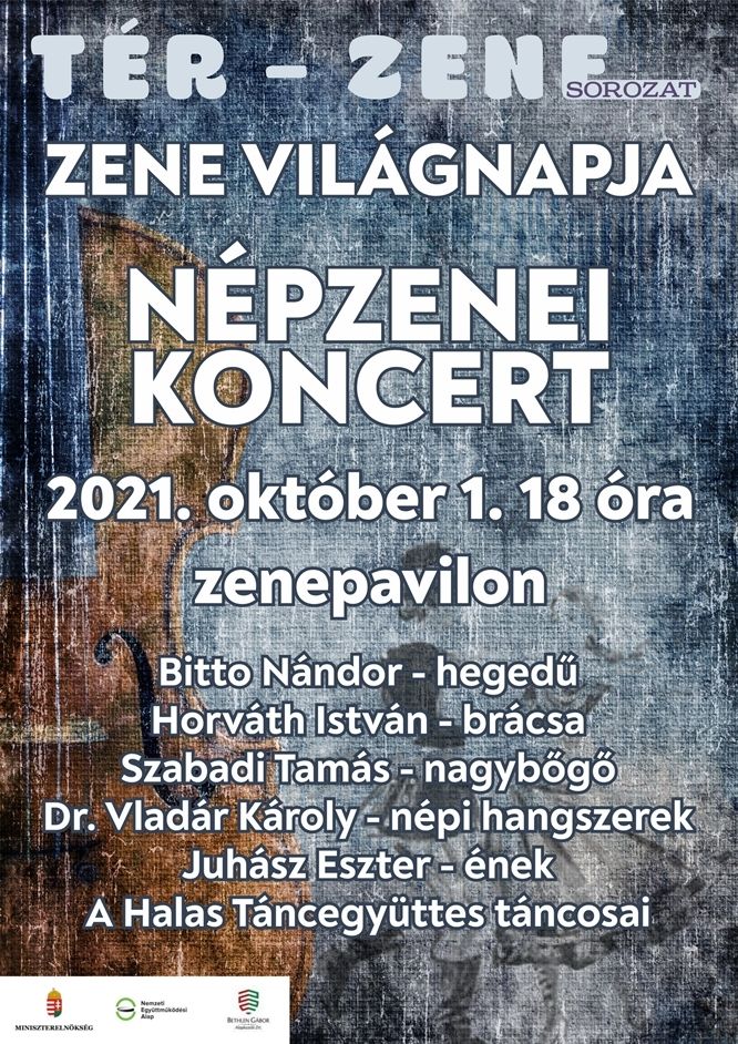 A Térzene koncertsorozat részeként, a Zene világnapja alkalmából október 1-jén este hat órától népzenei koncert lesz a főtéri zenepavilonnál. Az est különlegessége, hogy a hallgatnivaló mellett lesz bőven látnivaló is, hiszen a produkcióban közreműködnek a Halas Táncegyüttes tagjai is.