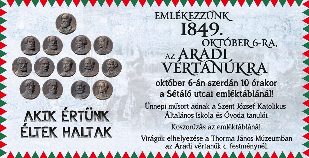 Október 6-án az Aradi vértanúkra emlékezünk. Szerdán délelőtt 10 órakor a Sétáló utcai emléktáblánál a Szent József Katolikus Általános Iskola diákjainak és pedagógusainak műsorát lehet megtekinteni. Ezt követően koszorúk, mécsesek elhelyezésére nyílik lehetőség az emléktáblánál, majd pedig a Thorma János Múzeumban.