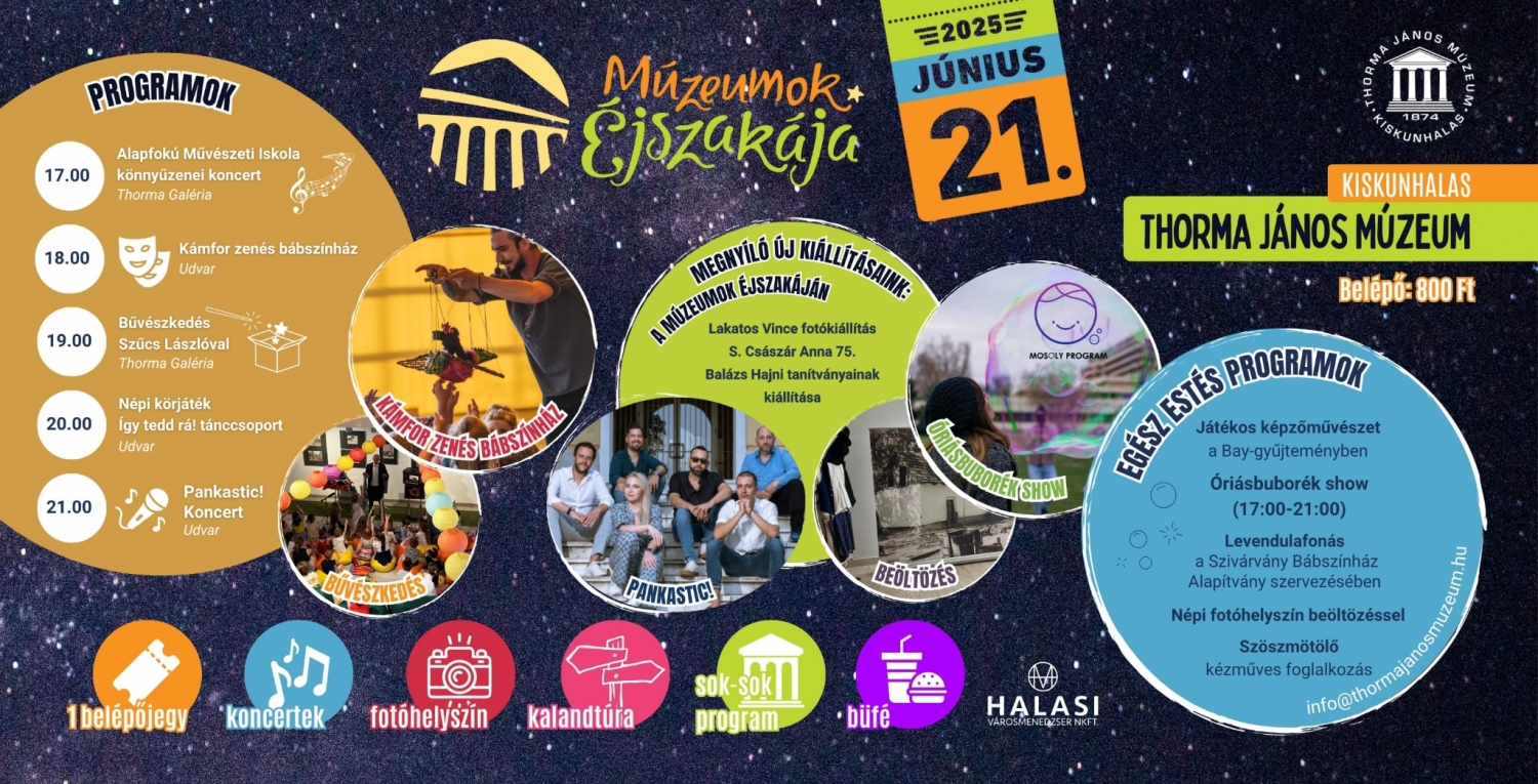 A művészet és az élmények éjszakája. Egy évben egyszer éjszaka is fogad vendégeket a Halasi Thorma János Múzeum. Az intézmény idén is csatlakozott az ország egyik legizgalmasabb kulturális eseményéhez, a Múzeumok Éjszakájához. Június 21-én, szombaton 17 órától egészen 23 óráig különleges nyitvatartással, - egy belépővel látogatható - sokféle eseménnyel várják az érdeklődőket. Lesznek kiállítások, táncos, zenés, bábos, bűvészes, játékos programok, de még óriásbuborék show is.