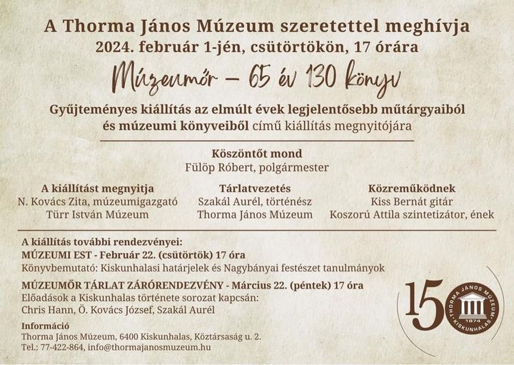 Az idei év első kiállítására készül a Thorma János Múzeum. A február elsején megnyíló gyűjteményes kiállítás az elmúlt évek legjelentősebb műtárgyait és múzeumi könyveit mutatja be. Többek között Szakál Aurél történész által szerzőként, szerkesztő ként megjelentetett 130 könyv kerül kiállításra. Az eseményre február 2-án, 17 órakor kerül sor.