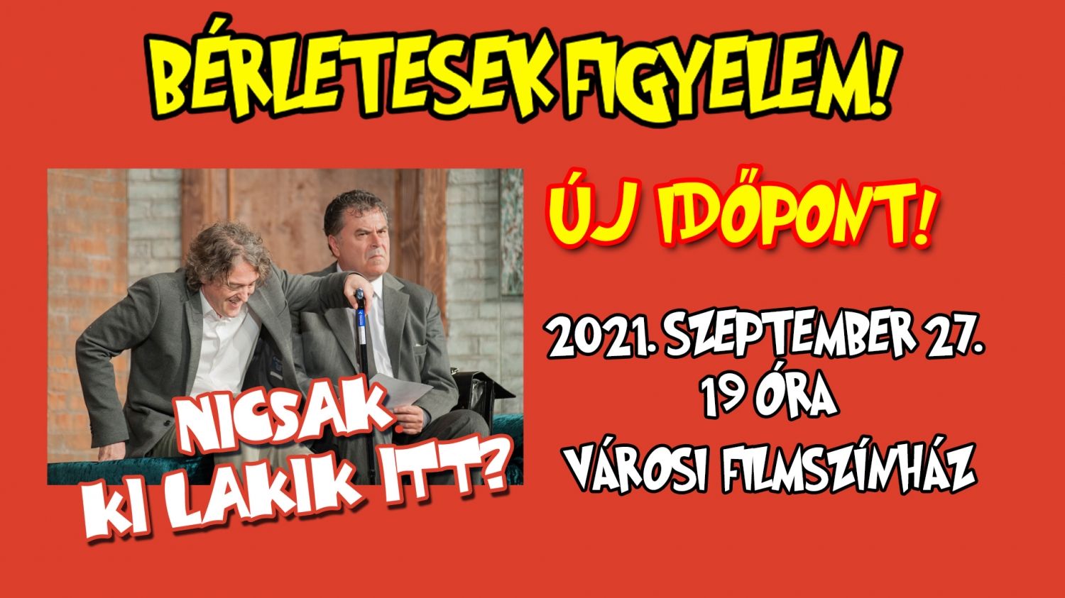 Tavaly többször elmaradt a Bánfalvy Stúdió vendégjátéka Kiskunhalason. A korábbi bérletes előadást szeptember 27-én 19 órakor tekinthetik meg a nézők a Városi Filmszínházban. A Nicsak, ki lakik itt?! című vígjáték főszerepében Beleznay Endrével találkozhat a közönség. A darab szerzője Michael Cooney.