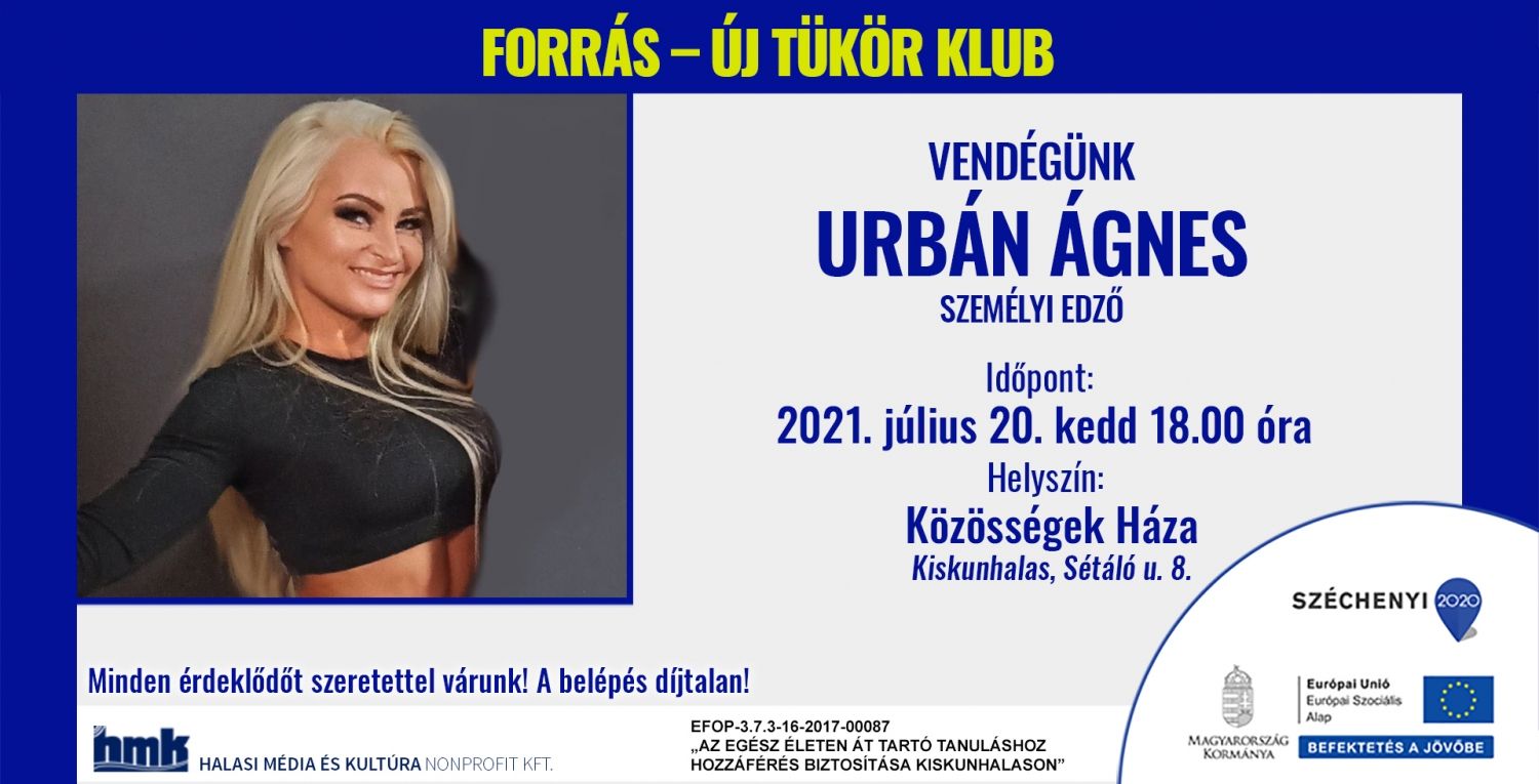 Az elmúlt hetek nagysikerű rendezvényei után újabb előadással folytatódik a Forrás- Új Tükör Klub sorozata. Július 20-án, kedden Urbán Ágnes személyi edző lesz a vendég, aki többek között pályájáról és az egészséges életmód fontosságáról beszél majd. A program 18 órakor kezdődik a Közösségek Háza nagytermében. A belépés természetesen most is díjtalan.