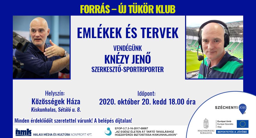 Emlékek és tervek. Újabb előadással jelentkezik Forrás Új - Tükör Klub. Október 20-án, kedden Knézy Jenő szerkesztő-sportriporter lesz a vendég. A beszélgetés 18 órakor kezdődik. A helyszín a Sétáló utcai Közösségek Háza.