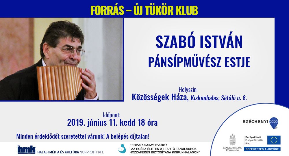A Forrás-Új Tükör Klub következő vendége Szabó István lesz. A pánsípművész hangszerbemutatót tart Kiskunhalason és az érdeklődő kérdésekre is válaszol. A rendezvénynek a Közösségek Háza ad otthont a Halasi Média és Kultúra Nonprofit Szolgáltató Kft. szervezésében június 11-én 18 órától.