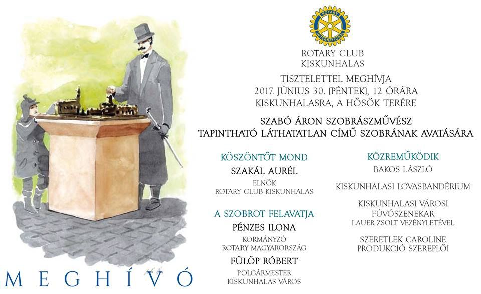 A megvalósulást több vállalkozás és magánszemély is segítette a halasi rotarysták mellett. Az ünnepélyes átadás június 30-án, pénteken lesz a Városházával szemben lévő ivókútnál. Szakál Aurél a club elnöke úgy fogalmazott, ettől központibb, méltóbb helyre nem is lehetne tenni Szabó Áron szobrászművész alkotását. Az eseményen a Városi Fúvószenekar zenéjét is meghallgathatják, az érdeklődők valamint fellépnek, a Szeretlek Caroline musical énekesei is. Köszöntőt mond Szakál Aurél, a helyi szervezet vezetője, a szobrot Pénzes Ilona a Rotary Magyarország kormányzója és Fülöp Róbert polgármester leplezik le. Nagy Viktor szervező szerint ez az alkotás egy nagy összefogás eredményeként született meg, Kiskunhalas lakosságának ajánlják ezt a köztéri alkotást, melynek avatására mindenkit szeretettel várnak pénteken délben a Városháza tornyánál.