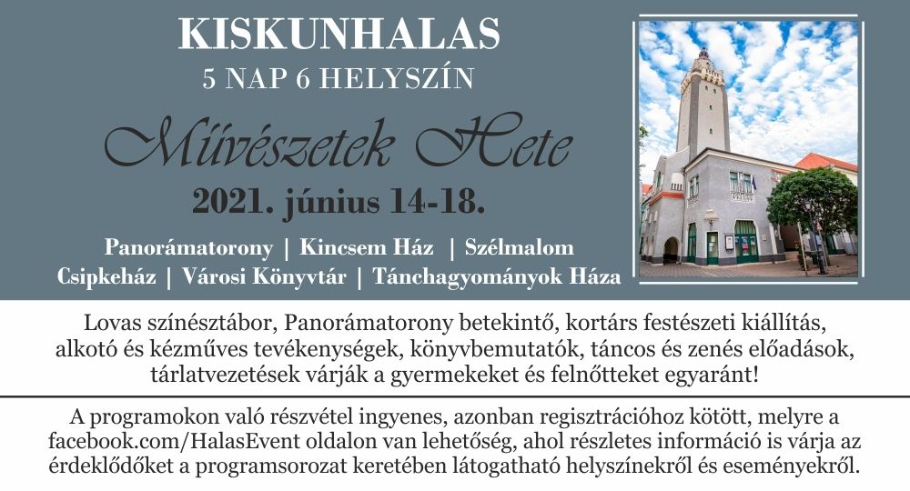 Művészetek Hete Halason hat helyszínen. Június 14-e és 18-a között a gyermekeket és a felnőtteket érdekes programok várják a Panorámatoronyban, a Kincsem Házban, a Szélmalomban valamint a Csipkeházban, a Városi Könyvtárban és a Tánchagyományok Házában. A helyszíneken helyi előadók és művészek várják az érdeklődőket, a Nemzeti Lovas Színház társulata pedig színésztábort tart 10 és18 év közötti fiatalok számára a Hirling József Lovasparkban. A programokon való részvétel ingyenes, de regisztrációhoz kötött.