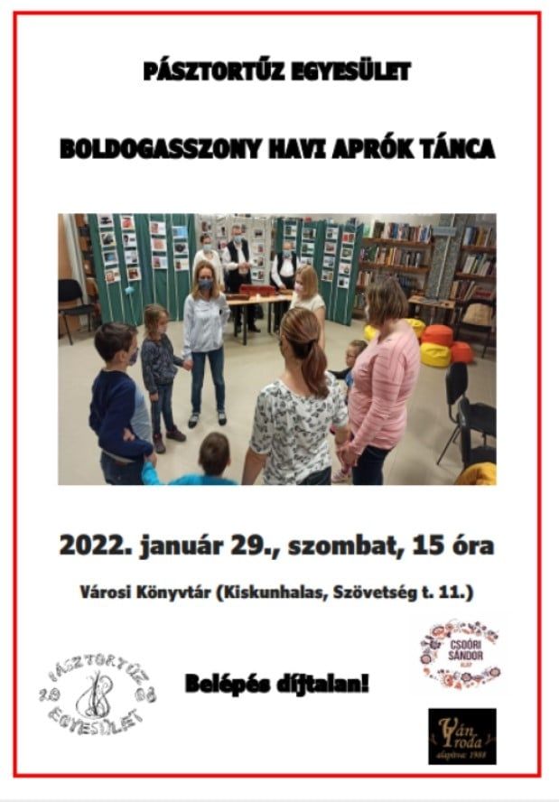 A halasi könyvtár lesz a helyszíne január 29-én. szombaton, 15 órától a Boldogasszony Havi Aprók Táncának is. A Fészekrakó és a Pásztortűz Egyesület szervezésében a 14 éven aluli gyerekeket és szüleiket tánc- és énektanítással, kézműves tevékenységgel várják.