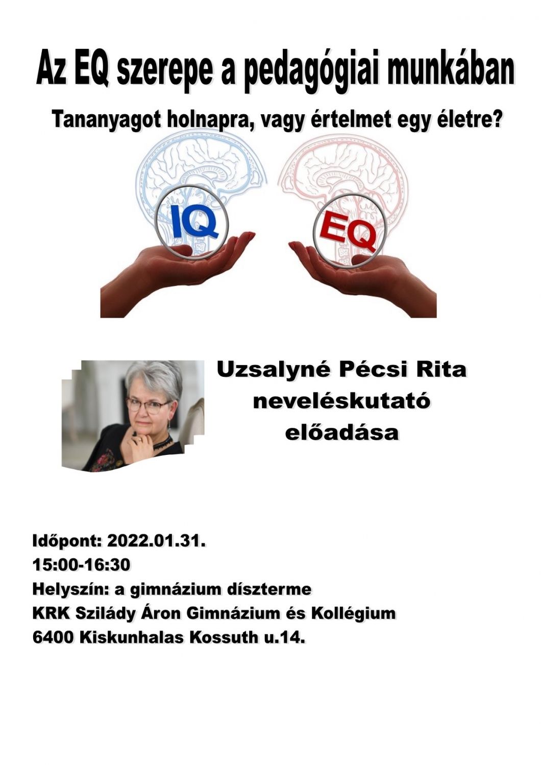 Az EQ szerepe a pedagógiai munkában – Tananyagot holnapra, vagy értelmet egy életre? Uzsalyné Pécsi Rita tart előadást kiskunhalason. A neveléskutató előadása január 31-én, délután 3 órakor kezdődik. Helyszín a KRK Szilády Áron Gimnázium díszterme. A programra minden érdeklődőt várnak.