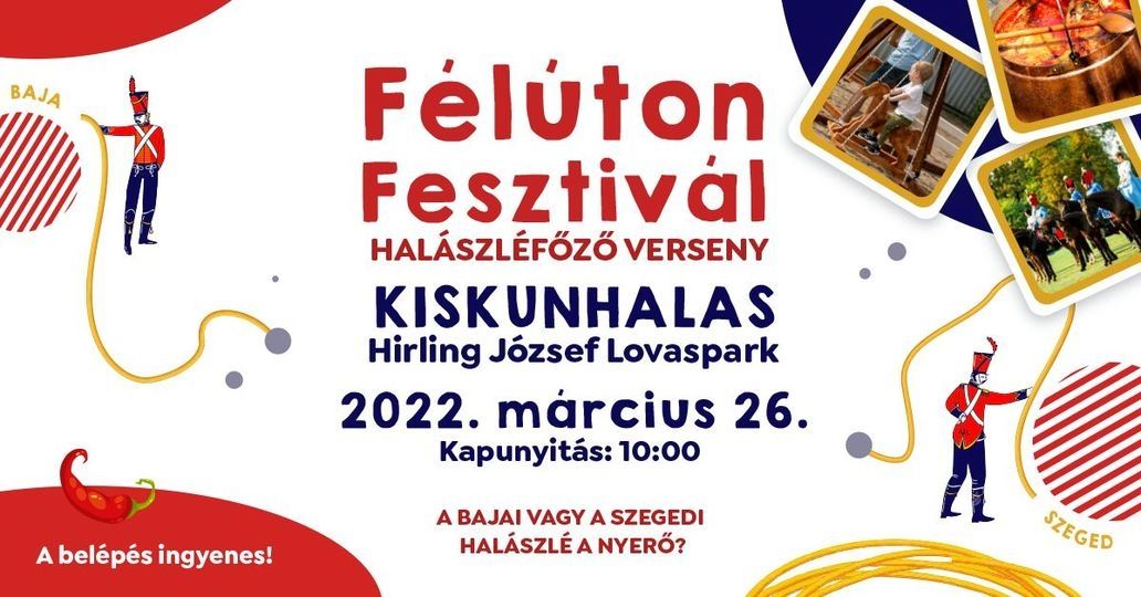 A bajai vagy a szegedi a nyerő? Halászléfőző verseny és szabadidős programok lesznek március 26-án a Hirling József Lovasparkban. A Félúton Fesztiválra az ország több régiójából és külföldről is érkeznek halászléfőzők. A nagyközönség számára is nyitva állnak a Lovaspark kapui. Szombaton 10 órától kezdődnek a szabadidős programok. A hangulatról egész napos élőzenével gondoskodik Radics Sándor cimbalomművészt. Fellp a LivingRoom együttes és Koppány, aki lemezbemutató koncertet tart. A gyerekeket játszóudvar, horgászat, légvár és VR világ várja.
