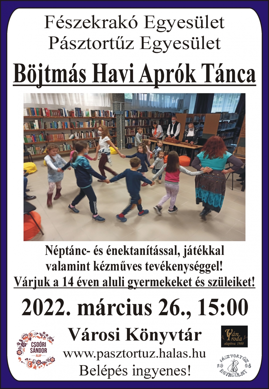 Böjtmás Havi Aprók Tánca. Március 26-án, szombat, 15 órakor a Fészekrakó és a Pásztortűz Egyesület tánc- és énektanítással, kézműves tevékenységgel várja a 14 éven aluli gyermekeket és szüleiket a Városi Könyvtárba.