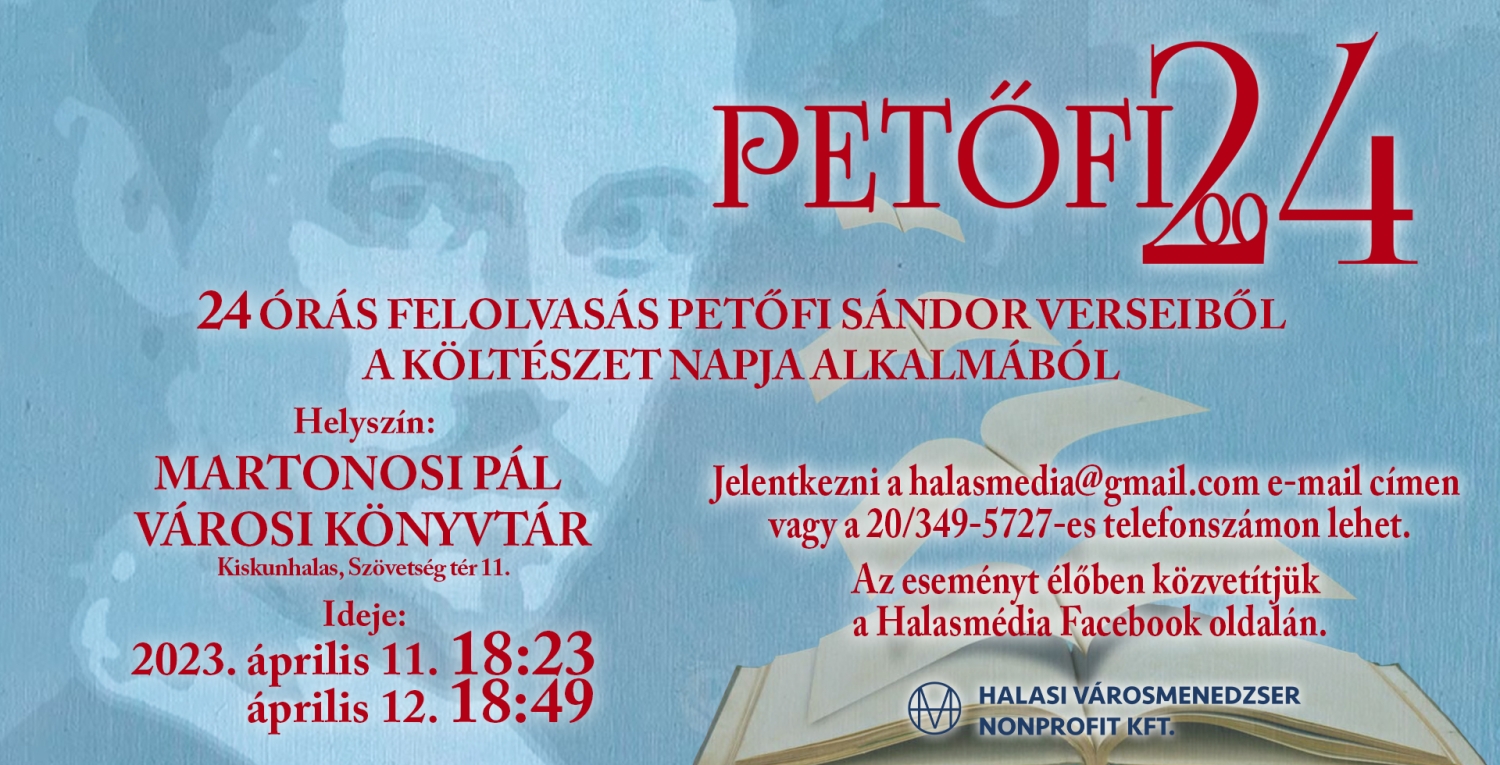 Verselés 24 órán át. Különleges programmal készül a költészet napjára és egyben tiszteleg Petőfi Sándor születésének 200. évfordulója előtt a Halasi Városmenedzser Kft. Április 11-én 18.23-tól április 12. 18.49-ig csak a nemzet költőjétől mondanak vagy olvasnak fel verseket a résztvevők. A nagyszabású, 24 órás eseménynek a Martonosi Pál Városi Könyvtár ad otthont. A programra egyesületek, magánszemélyek, oktatási intézmények egyaránt meghívást kaptak. Az eseményt a Halasmédia Facebook-oldalán élőben közvetíti.