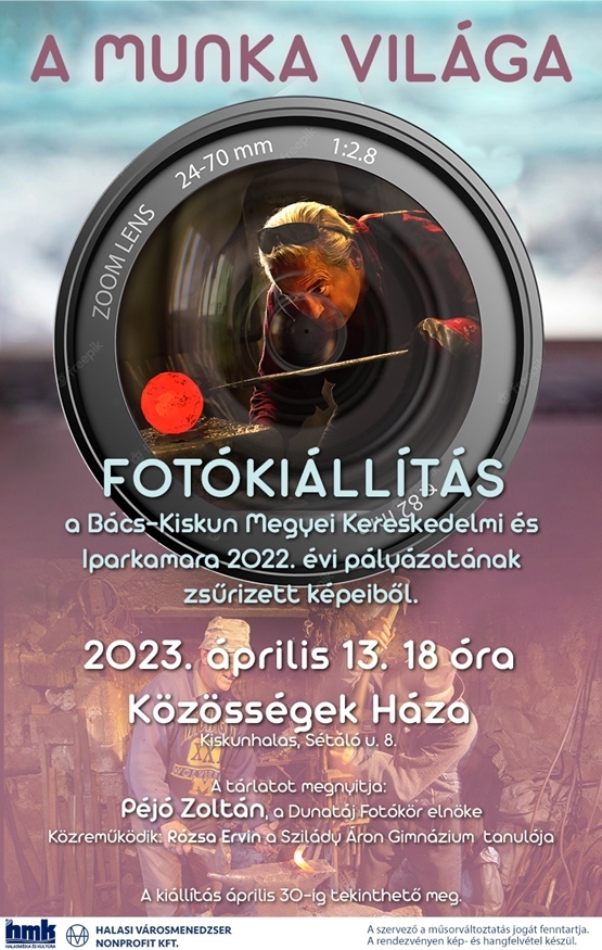 A Munka világa címmel fotókiállítás nyílik a Bács-Kiskun Vármegyei Kereskedelmi és Iparkamara 2022-es pályázatának zsűrizett képeiből. A nyitó ünnepség április 13-án 18 órakor lesz a halasi Sétáló utcai Közösségek Házában.