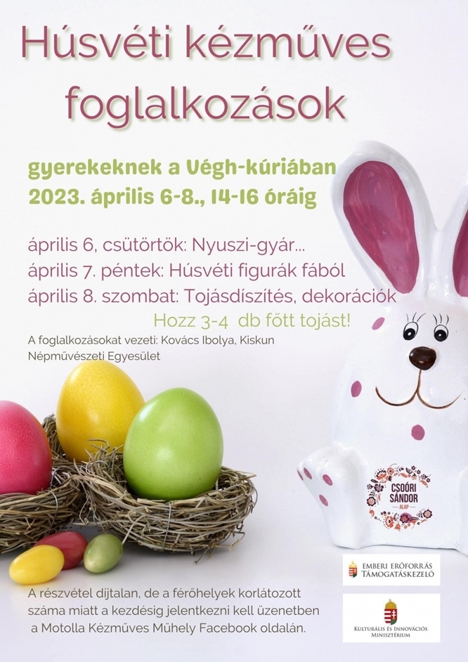 Húsvéti kézműves foglalkozások lesznek gyerekeknek a Végh-kúriában. 7-én pénteken húsvéti figurák készülnek fából, 8-án szombaton tojásdíszítés lesz. A foglalkozásokat Kovács Ibolya vezeti. A részvétel díjtalan, de a Motolla Kézműves Műhely facebook oldalán kell jelentkezni. A foglalkozások 14 órakor kezdődnek.