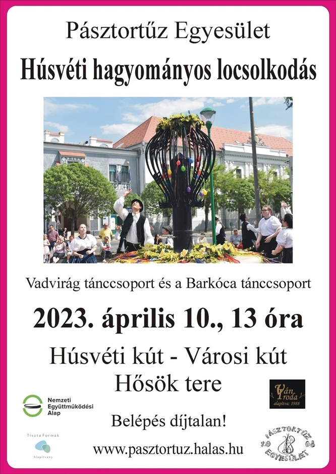 Húsvéti hagyományos locsolkodást tart a Pásztortűz Egyesület április 10-én, hétfőn 13 órakor. Helyszín a feldíszített városi kút a Hősök terénél. A hagyományőrző eseményen a Vadvirág és a Barkóca tánccsoport tagjai közreműködnek.