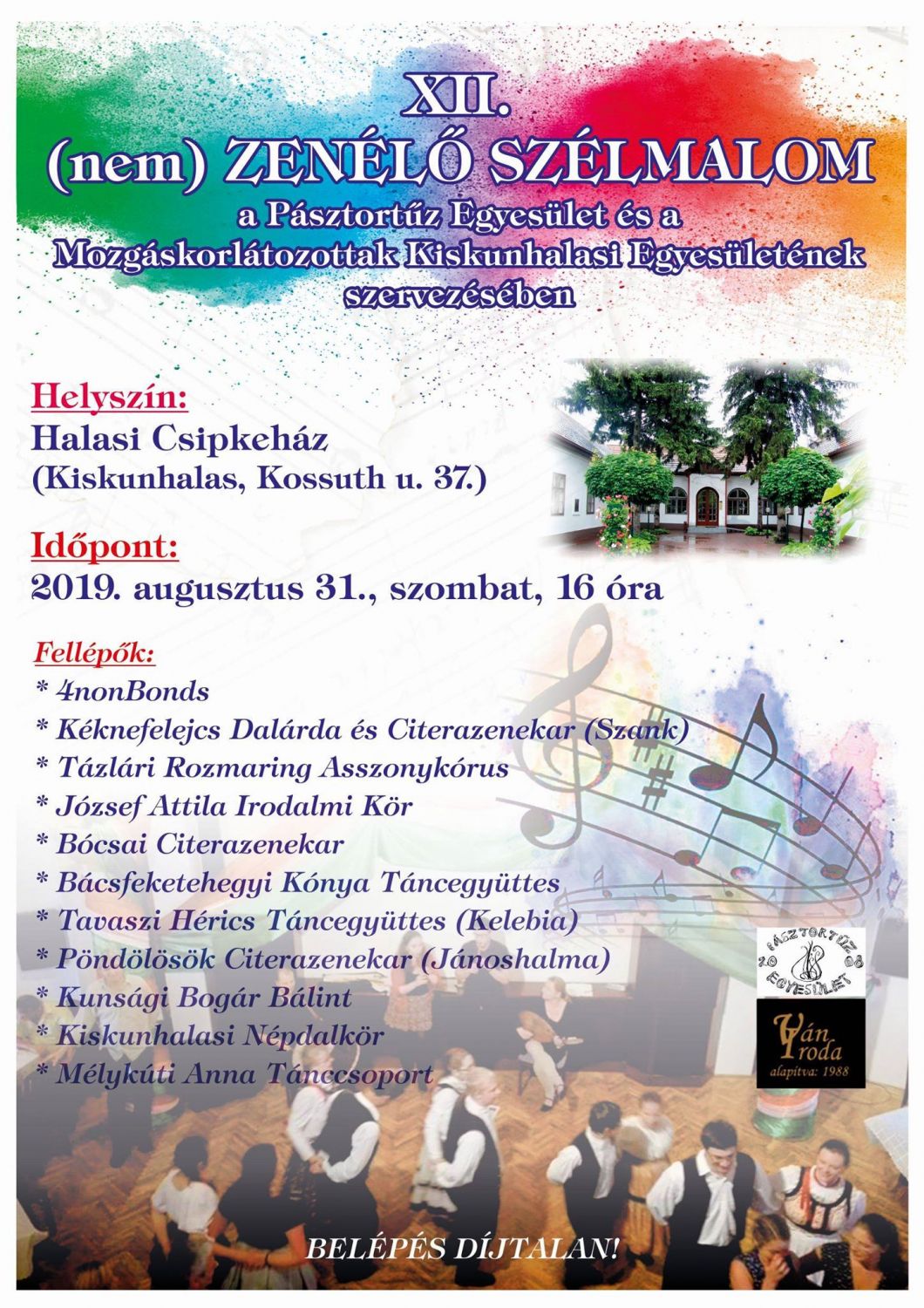 A hónap utolsó napján, augusztus 31-én, szombaton folytatódik a Zenélő szélmalom sorozat a Pásztortűz Egyesület és a Mozgáskorlátozottak Kiskunhalasi Egyesületének szervezésében. A Csipkeház ad otthont a rendezvénynek. A 16 órakor kezdődő eseményen fellép többek között a 5nonBonds, a Kéknefelejcs dalárda, a József Attila Irodalmi Kör, valamint a Tázlári Rozmaring Asszonykórus, a Kiskunhalasi Népdalkör és a Mélykúti Anna Tánccsoport. A belépés most is ingyenes.