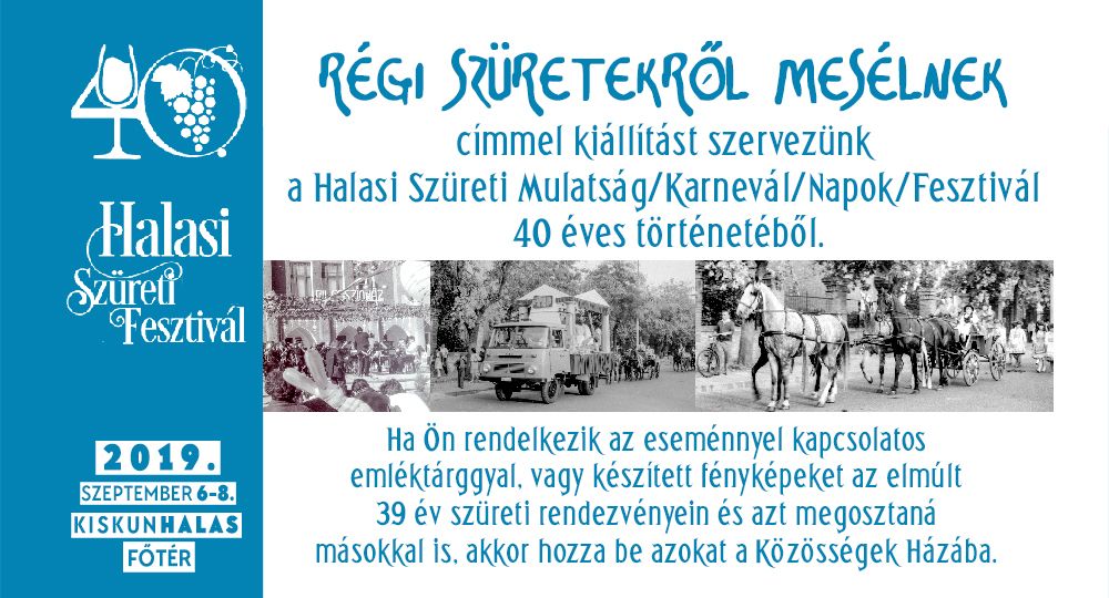 Egy érdekes kiállítás vezeti fel a jövő héten a Halasi Szüreti Fesztivált. Régi szüretekről, az elmúlt évtizedekről mesélnek majd a képek és az emléktárgyak a Sétáló utcai Közösségek Házában. A kiállítás szeptember 4-én, szerdán 17 órától várja az érdeklődőket. Szőke Sándor a Városért Közalapítvány kuratóriumi elnöke nyitja meg a tárlatot. Közreműködik a Halasi Népdalkör. Hogy minél sokoldalúbb legyen a kiállítás, a Halasi Média és Kultúra kft. szervezőcsapata a lakosság segítségét is kérte. Sokan adtak be fényképeket, amit köszönnek a szervezők. A kiállításra szánt emléktárgyakat viszont még most is be lehet vinni a Közösségek Házába.