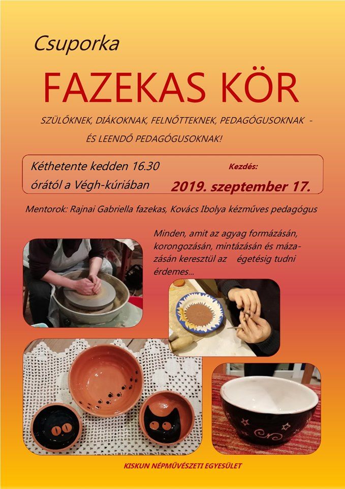 Indul a Csuporka Fazekas Kör. Szülőket, diákokat, felnőtteket, pedagógusokat várnak kéthetente keddenként a Végh-kúria műhelyébe. A foglalkozásokat Rajnai Gabriella fazekas és Kovács Ibolya kézműves pedagógus vezeti. Az első foglalkozás szeptember 17-én délután fél 5-kor kezdődik. A résztvevők itt mindent megtanulhatnak az agyag formázásáról, a korongozásról, a mintázásról, a mázazásról, valamint a kerámiák égetésről.