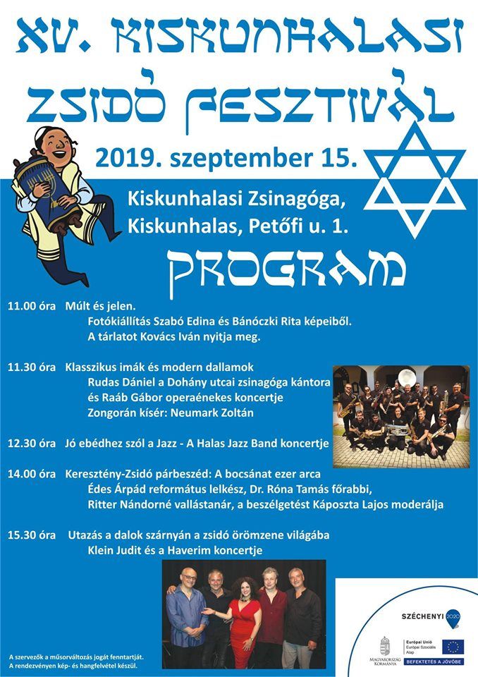 A 15. Zsidó Fesztivál házigazdája lesz vasárnap a halasi zsinagóga. A szervezők többféle programmal is készülnek. 11 órakor fotókiállítás nyílik múlt és jelen címmel, majd klasszikus imák és modern dallamok szólalnak meg. Ebéd tájékán a Halas Jazz Band koncertje szerepel a programban. Délután keresztény-zsidó párbeszéd veszi kezdetét Édes Árpád református lelkésszel és Róna Tamás főrabbival. A zsidó fesztivált Klein Judit és a Haverim koncertje zárja. A fesztiválra valószínűleg idén is sok látogató érkezik.