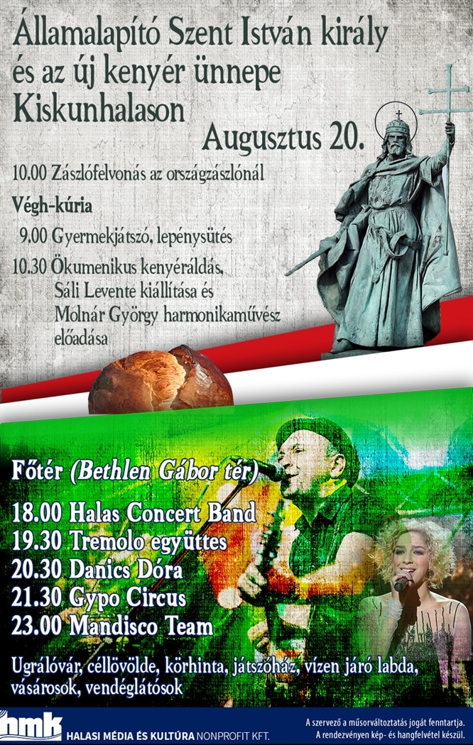 Este újra a főtér lesz a programok helyszíne, itt 18 órakor a Halas Concert Band lép színpadra, őket követi a Tremolo együttes majd Danics Dóra koncertje. 21.30-kor csap a húrok közé a Gypo Circus, majd a Mandisco Team szórakoztatja a közönséget.