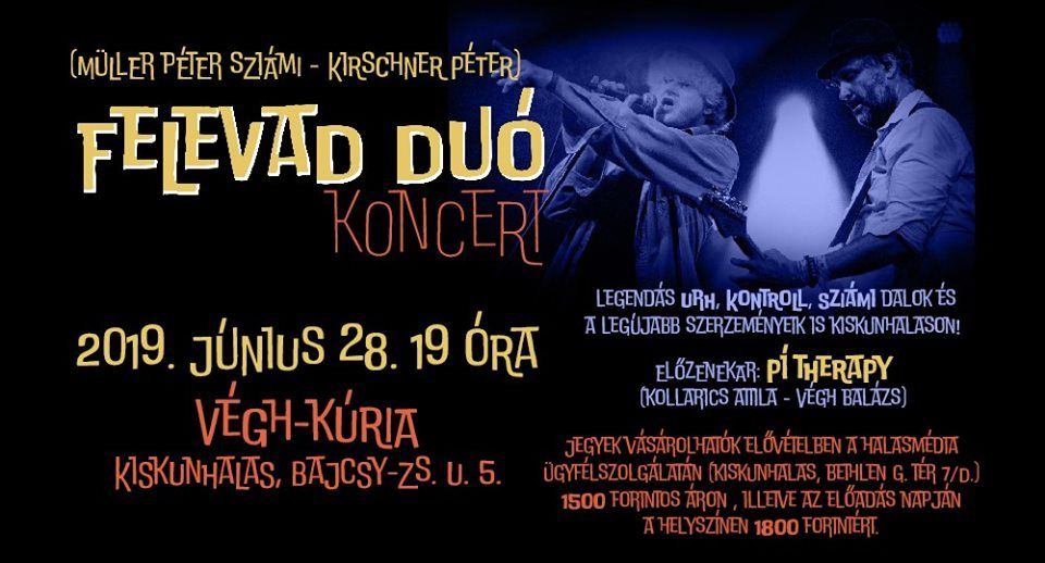 Az életmű jelentős, rengeteg dal közül lehet választani. Müller Péter Sziámi, a magyar underground jeles alakja, a Sziget Fesztivál és a Miskolci Nemzetközi Operafesztivál életre hívója, korszakokat átívelő dalok szövegírója Kiskunhalason koncertezik majd. Sziámi ezúttal a Felevad Duó nevű formáció tagjaként énekli azokat a szerzeményeket, amelyeket sokan közösségformálóként emlegetnek. Kirschner Péter gitáros társaságában a méltán legendás URH, a Kontroll Csoport és természetesen a Sziámi szerzeményeket is meg lehet hallgatni a különlegesnek ígérkező esten pénteken 19 órától, a Végh-kúriában. Müller Péter egy évvel ezelőtt, a Lelki Karbantartó Napokon vendégeskedett Kiskunhalason és akkor közösen énekelt az Ékes Kapu Otthon lakóival.
