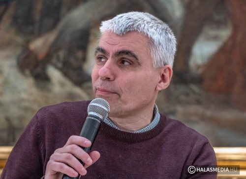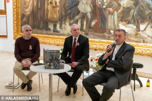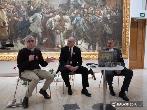 Kollarics Gábor, a kötet egyik szerzője, nem mellesleg a múzeum művészettörténész-muzeológusa rögtön egy nyilvánosságra került félreértés tisztázásával kezdte előadását. Az M5 Televízió műsorában vetített kisfilmben a monumentális festményről kerültek napvilágra téves információk. A kötet többek között ezeket a félreértéseket is tisztázza, no meg időrendben is végig kíséri a vázlatoktól a kész műig a kép létrejöttét. Kutatómunkájában nagy segítséget adott kolléganője Szabó Krisztina – emelte ki Kollarics.