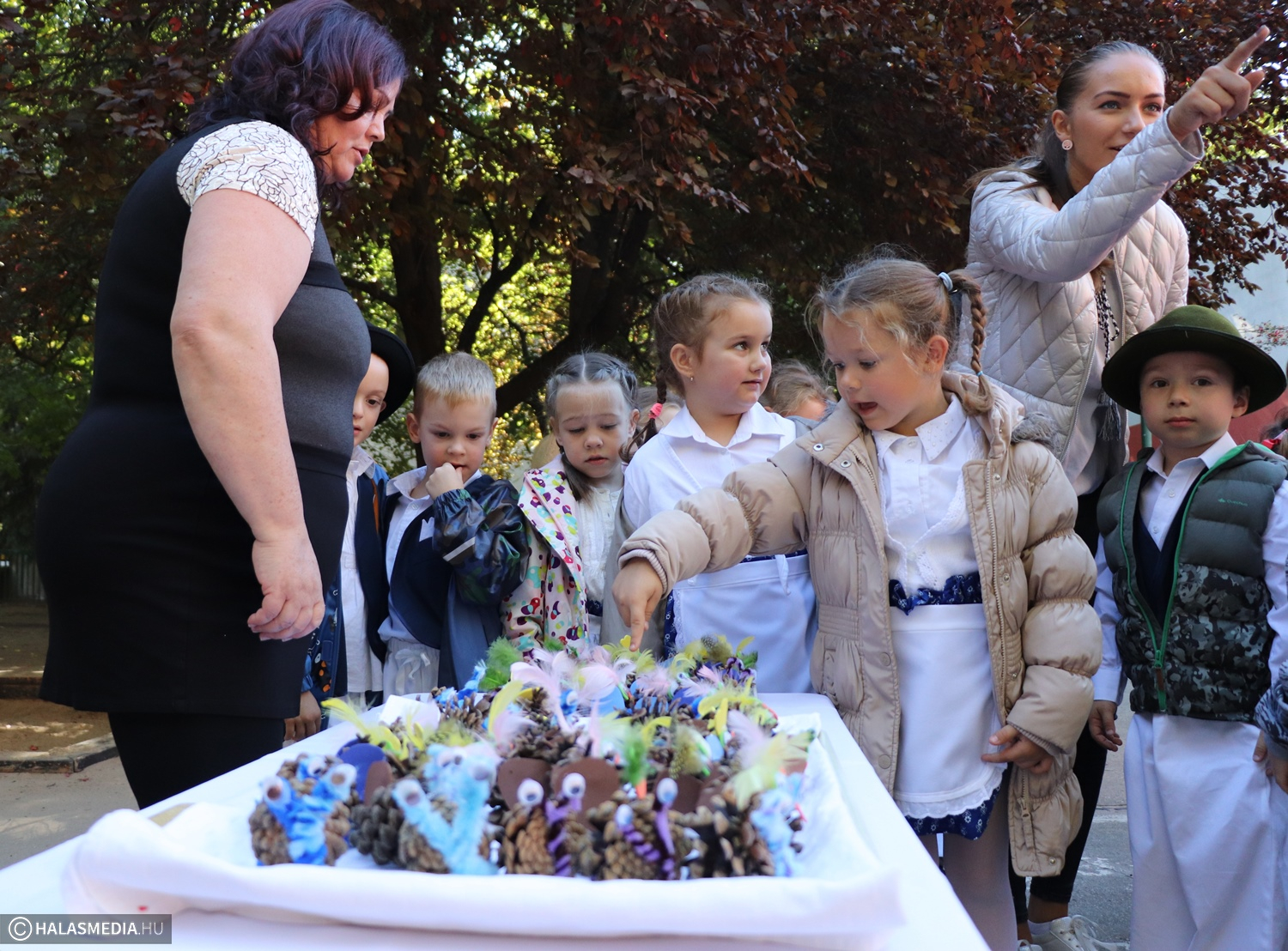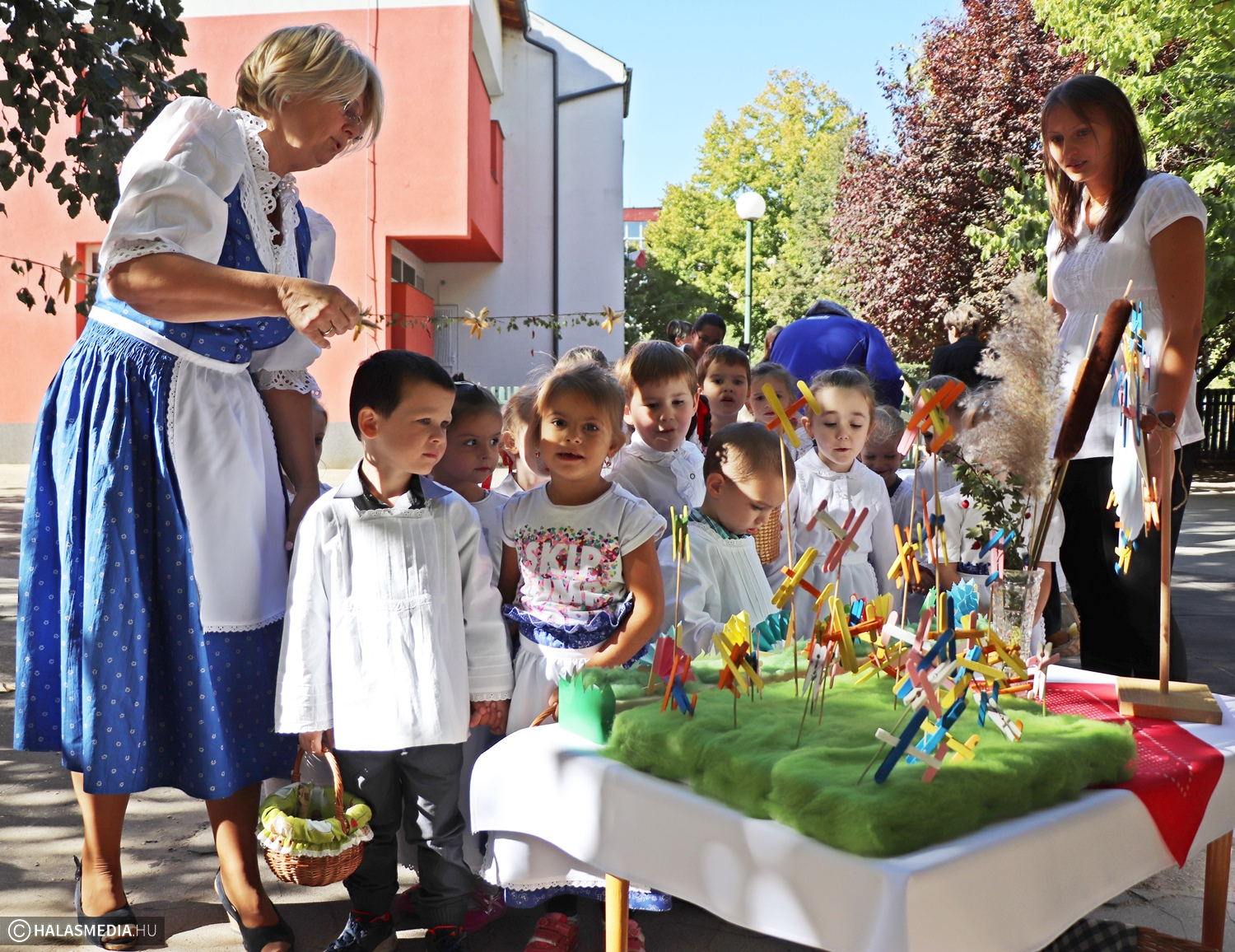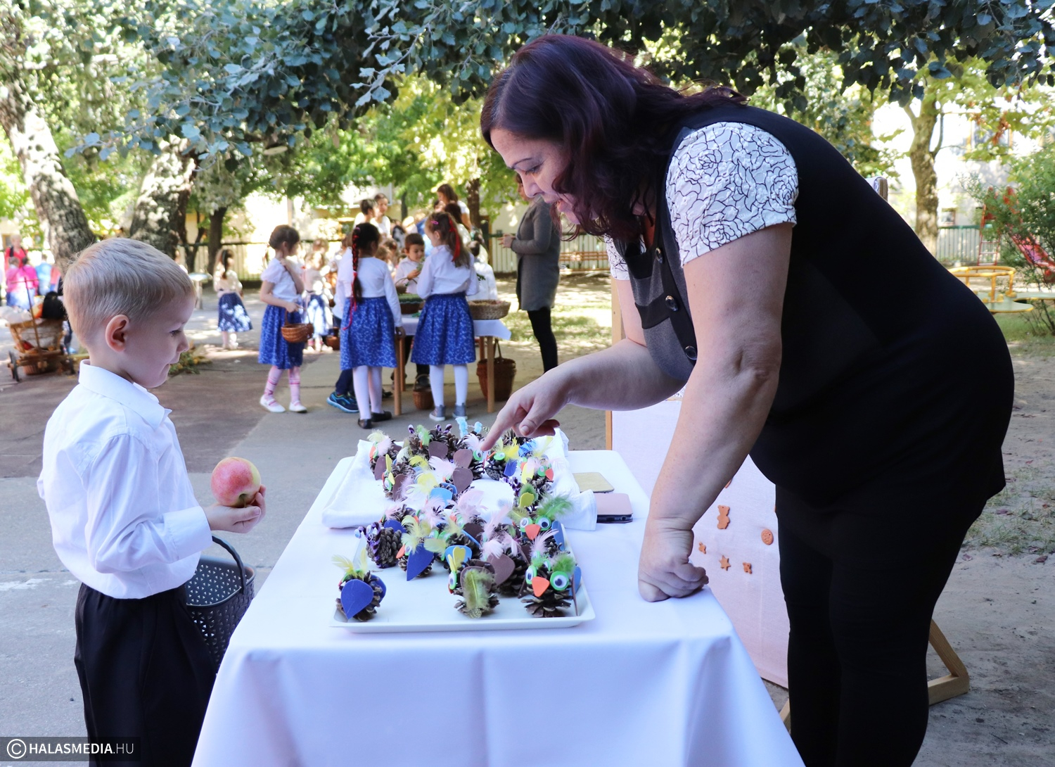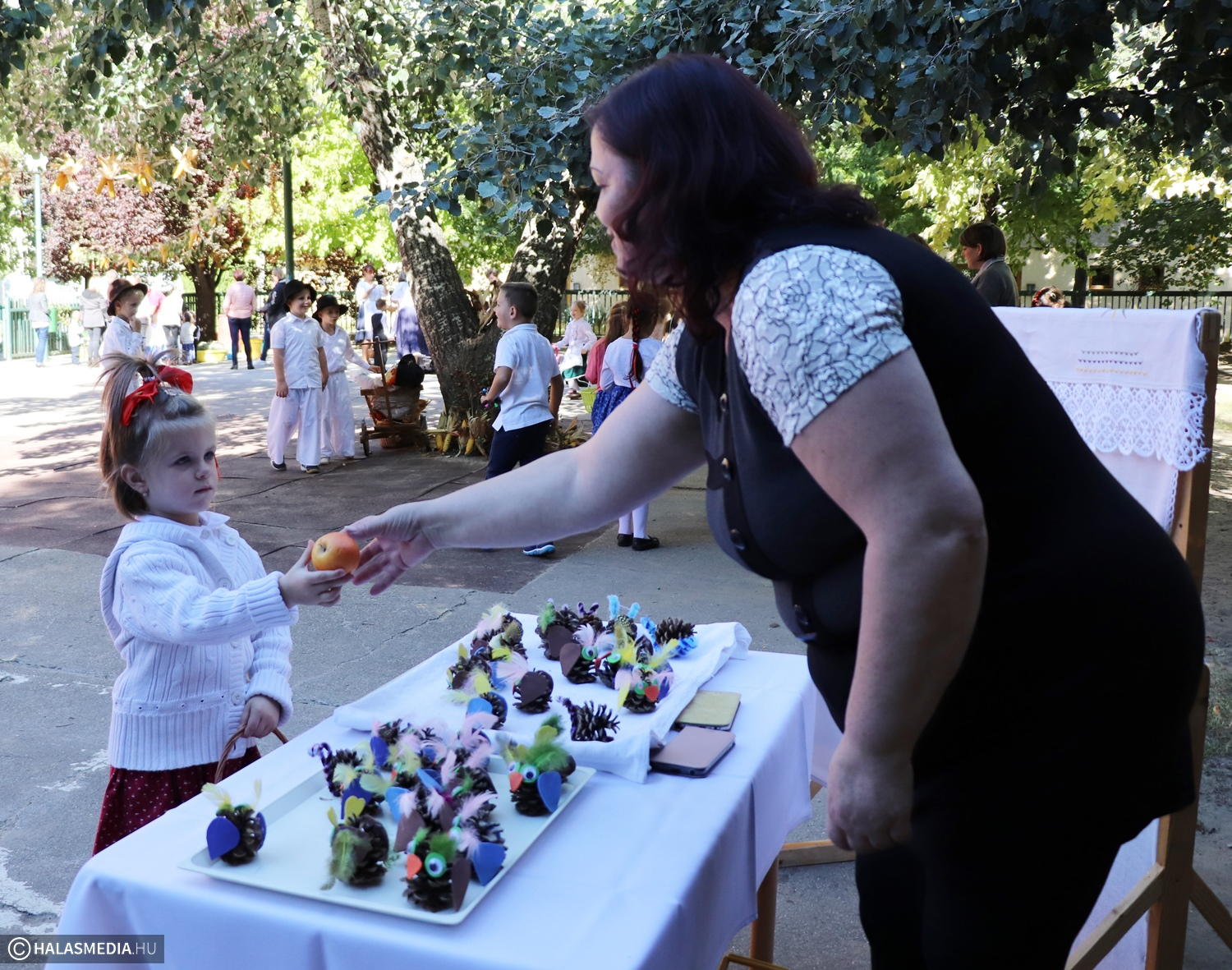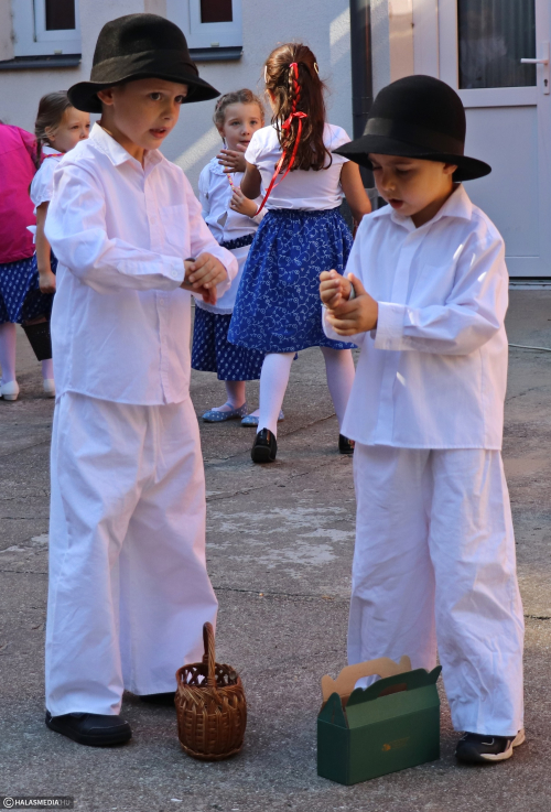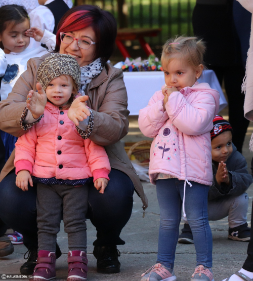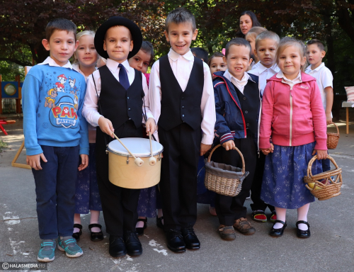 - Adatik tudtára kicsiknek és nagyoknak! Az óvodánkban ma híres nap vagyon! Aprók vásárára készülünk mi nagyon! Akad itt minden, mi szem-szájnak ingere, sósperec, mézeskalács, tükrösszív, nyakbavaló! Vásároljon, mulasson az óvoda apraja és nagyja, nehogy üres kiskosárral menjetek ma haza! Ezennel a vásárt megnyitom! Jó mulatságot kívánok!- ezzel a mondókával dobolta ki a kisbíró a program kezdetét. A kislányok és kisfiúk gyümölcsért cserébe készzel készített ajándékokat vihettek haza. Nagy sikere volt a vásárnak, csakúgy, mint a közös táncnak. Volt szőlőpréselés is, a finom nedüt aztán a gyermekek az ebédhez fogyasztották el.