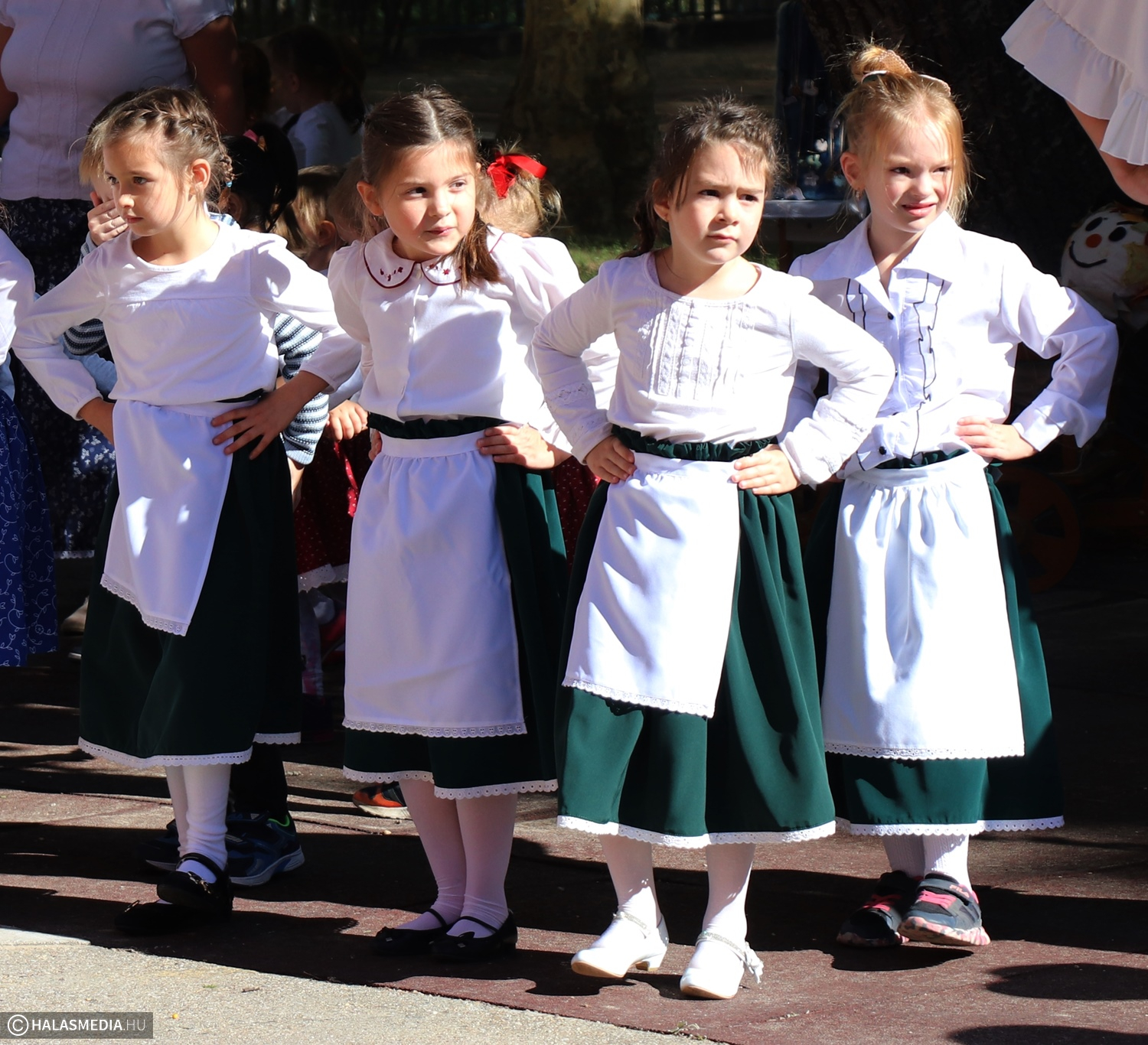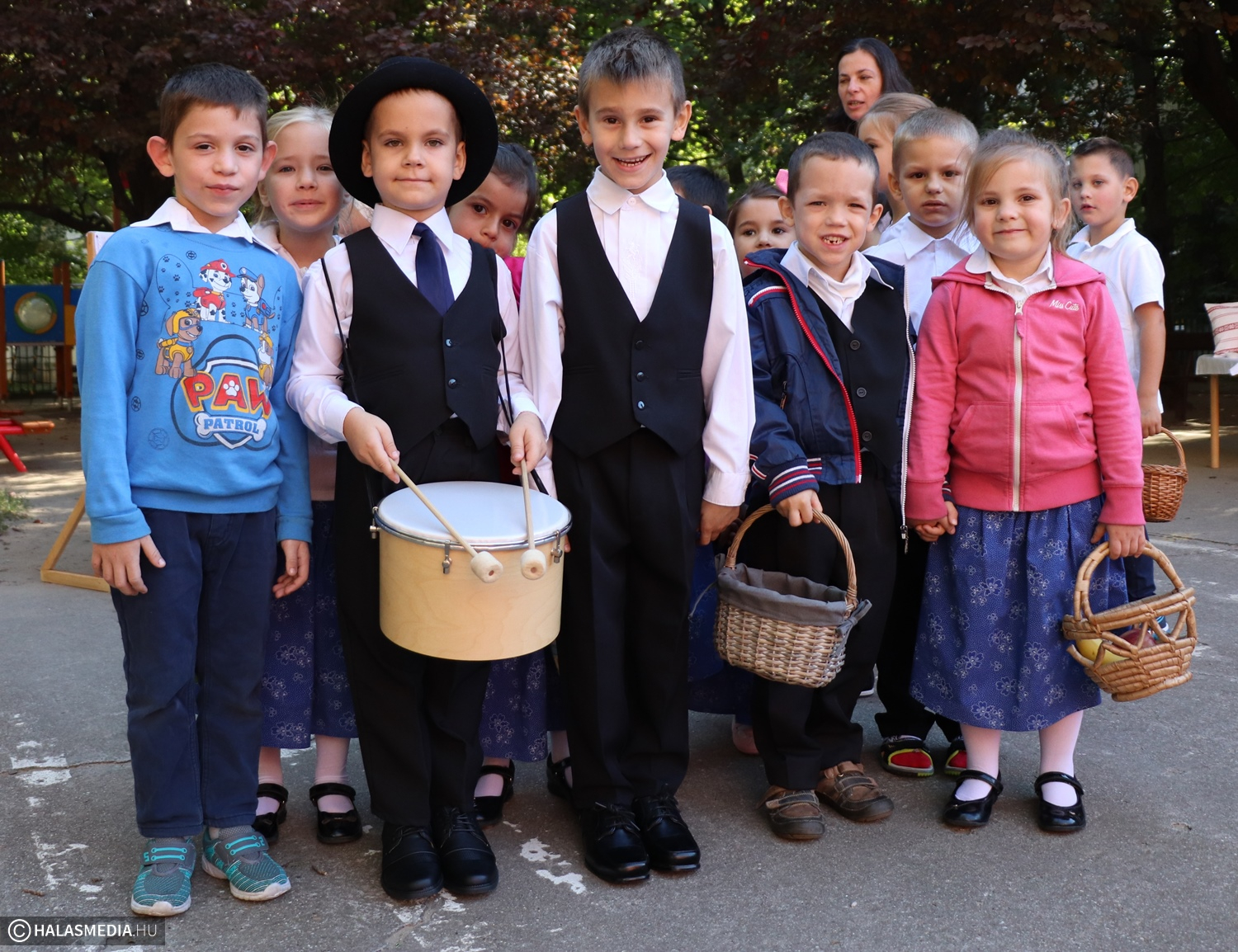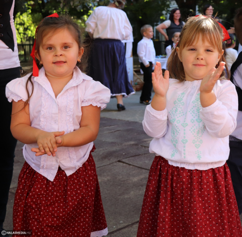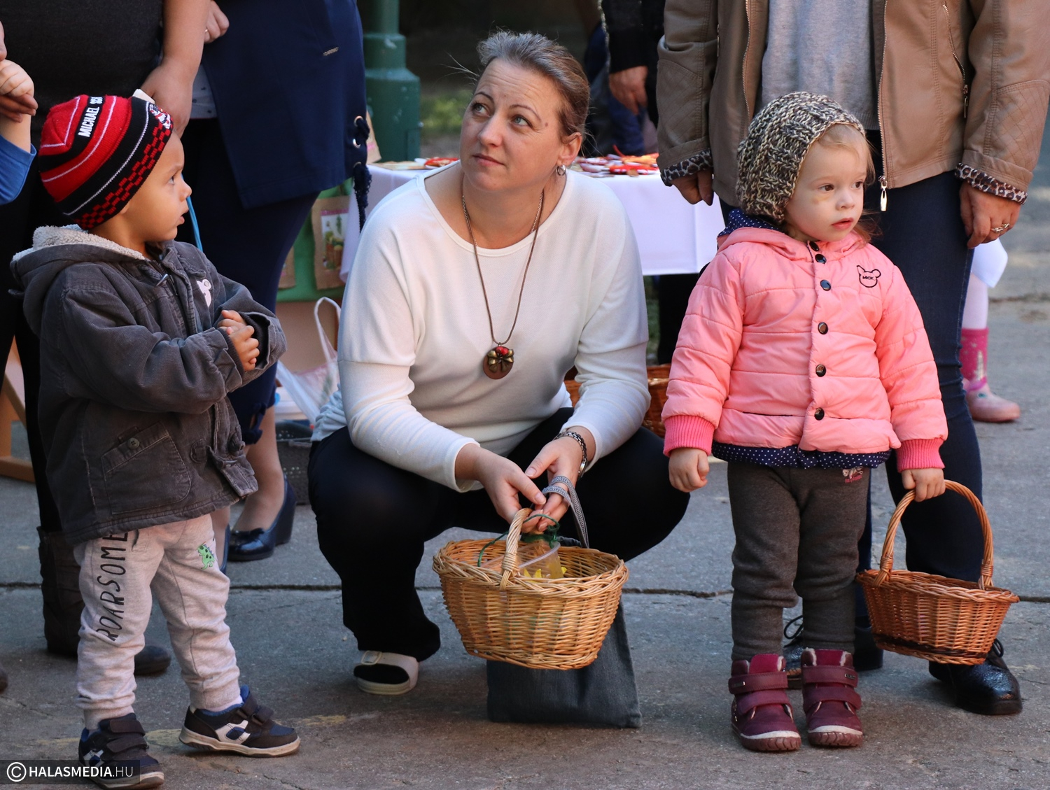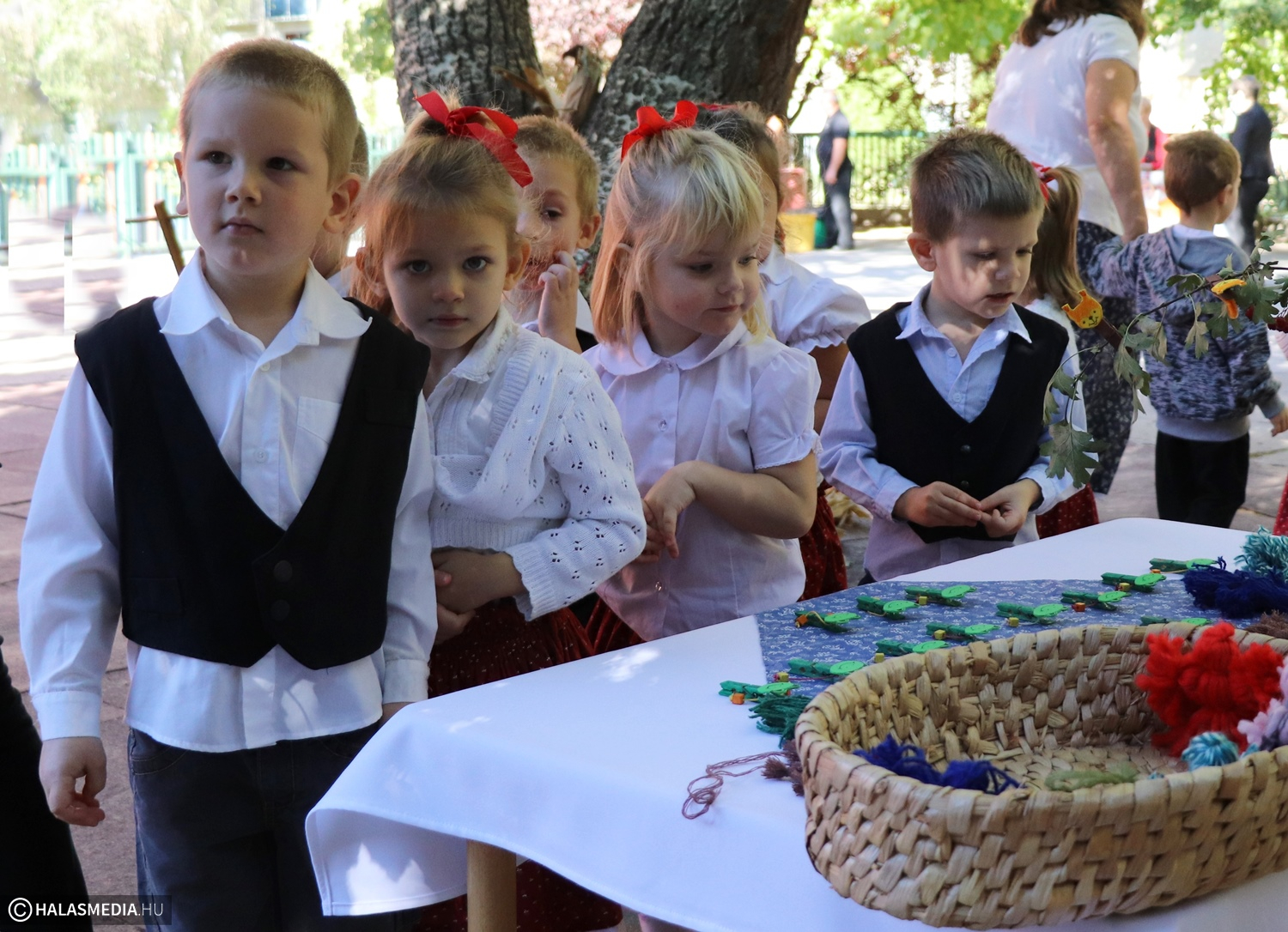 - Adatik tudtára kicsiknek és nagyoknak! Az óvodánkban ma híres nap vagyon! Aprók vásárára készülünk mi nagyon! Akad itt minden, mi szem-szájnak ingere, sósperec, mézeskalács, tükrösszív, nyakbavaló! Vásároljon, mulasson az óvoda apraja és nagyja, nehogy üres kiskosárral menjetek ma haza! Ezennel a vásárt megnyitom! Jó mulatságot kívánok!- ezzel a mondókával dobolta ki a kisbíró a program kezdetét. A kislányok és kisfiúk gyümölcsért cserébe készzel készített ajándékokat vihettek haza. Nagy sikere volt a vásárnak, csakúgy, mint a közös táncnak. Volt szőlőpréselés is, a finom nedüt aztán a gyermekek az ebédhez fogyasztották el.