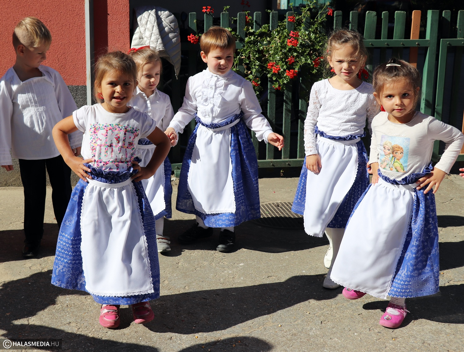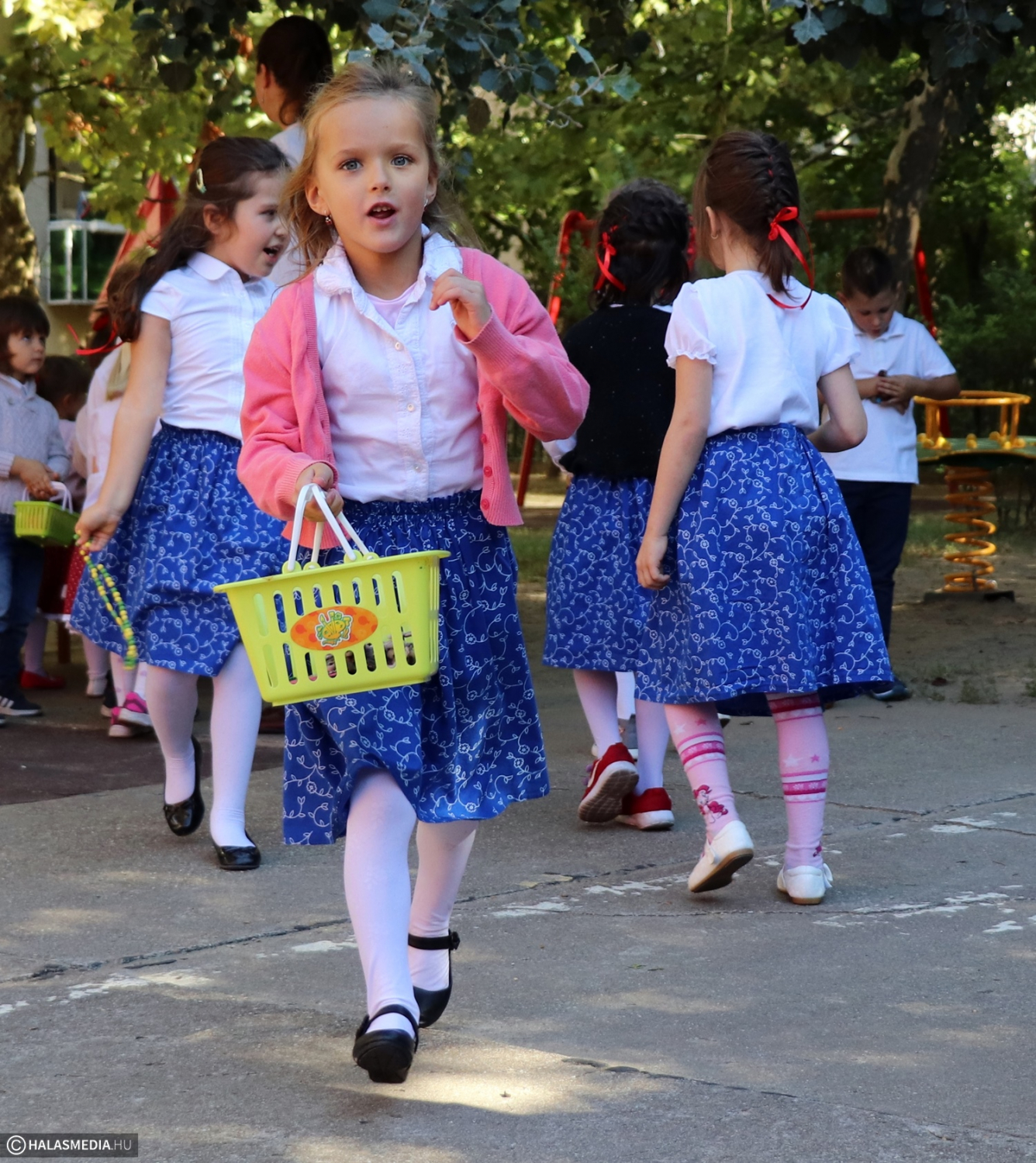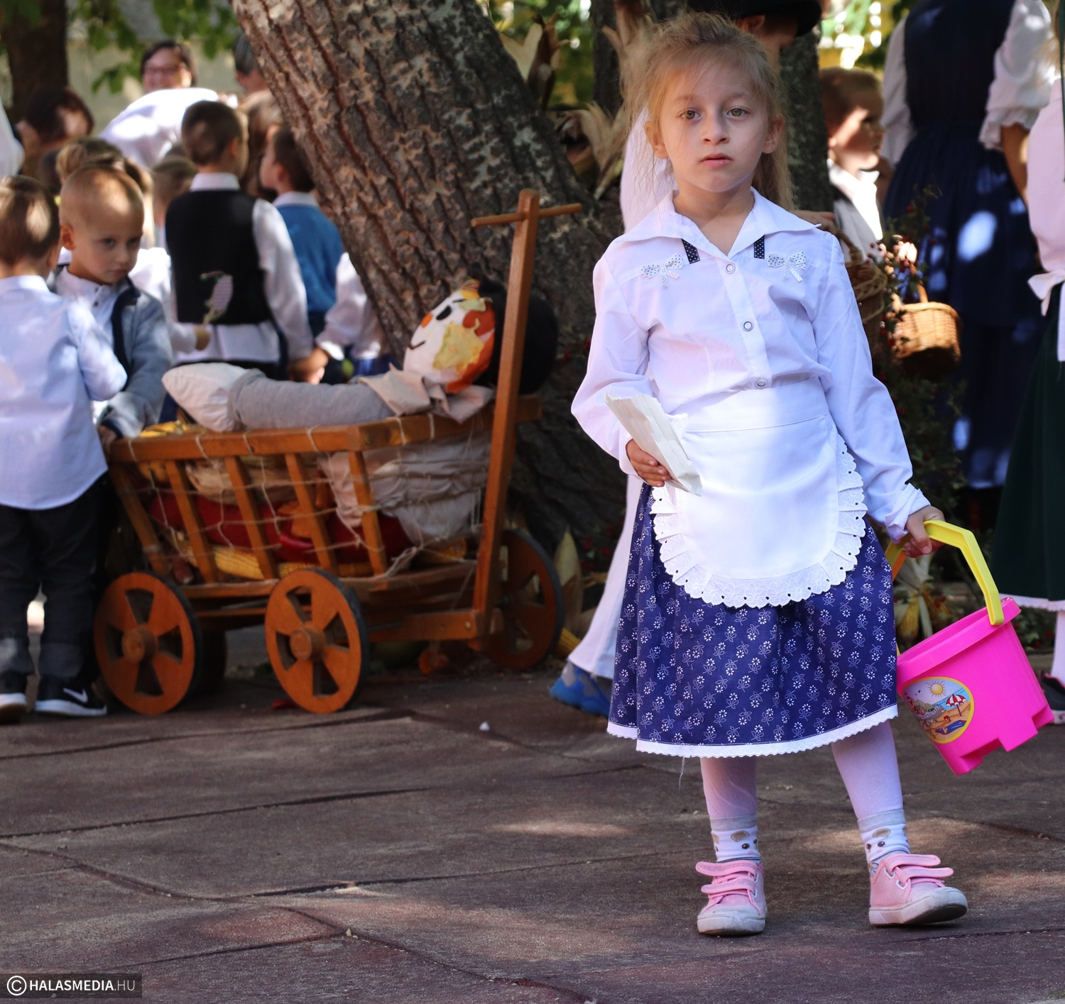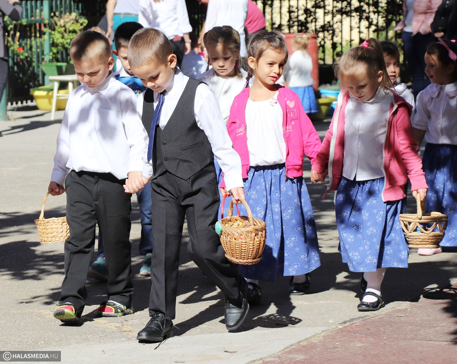 - Adatik tudtára kicsiknek és nagyoknak! Az óvodánkban ma híres nap vagyon! Aprók vásárára készülünk mi nagyon! Akad itt minden, mi szem-szájnak ingere, sósperec, mézeskalács, tükrösszív, nyakbavaló! Vásároljon, mulasson az óvoda apraja és nagyja, nehogy üres kiskosárral menjetek ma haza! Ezennel a vásárt megnyitom! Jó mulatságot kívánok!- ezzel a mondókával dobolta ki a kisbíró a program kezdetét. A kislányok és kisfiúk gyümölcsért cserébe készzel készített ajándékokat vihettek haza. Nagy sikere volt a vásárnak, csakúgy, mint a közös táncnak. Volt szőlőpréselés is, a finom nedüt aztán a gyermekek az ebédhez fogyasztották el.