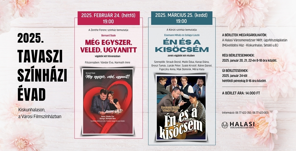 2025-ben ismét nagyszerű színészek és remek előadások várják a nézőket a kiskunhalasi tavaszi évadban. A bérletek keretében két darabot láthatnak a nézők és különálló előadásként érkezik a Padlás. Február 24-én, hétfőn 19 órai kezdettel a Zenthe Ferenc színház előadásában a „Még egyszer, veled, ugyanitt” című vígjáték, míg március 25-én, kedden, szintén 19 órakor a Körúti színház „Én és a kisöcsém” című zenés vígjátéka kerül bemutatásra. Bérleten kívüli előadásként április 7-én a Magyarock Dalszínház mutatja be a Padlást.