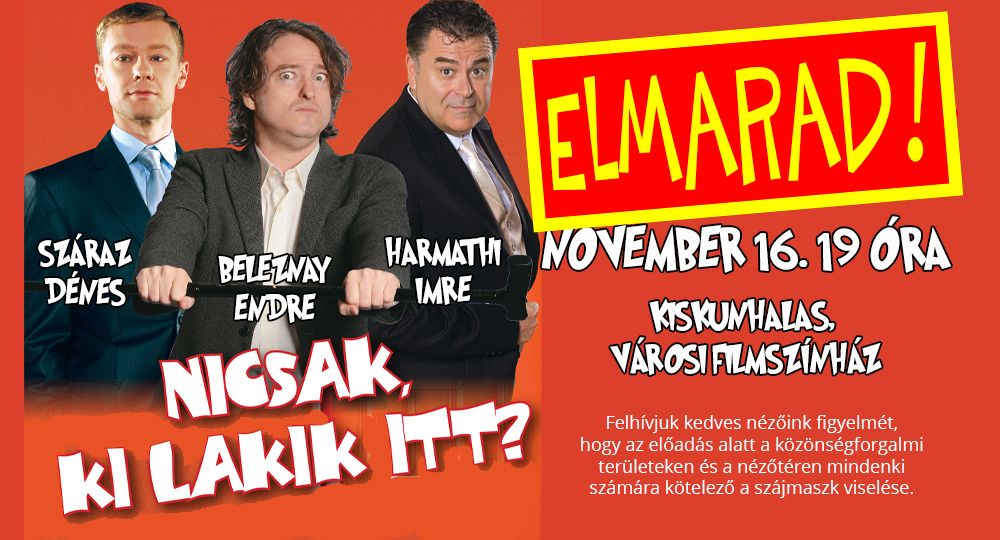 Az aktuális szabályok betartása érdekében sorra le kell mondani programokat. Nem lesz megtartva a november 14-re meghirdetett Folk est a Közösségek Házában. Ugyancsak elmarad a Nicsak, ki lakik itt című darab bemutatója is, mely a tavaszi színházi évad harmadik előadása lett volna, ám a koronavírus-veszély miatt már többször is el kellett halasztani.
