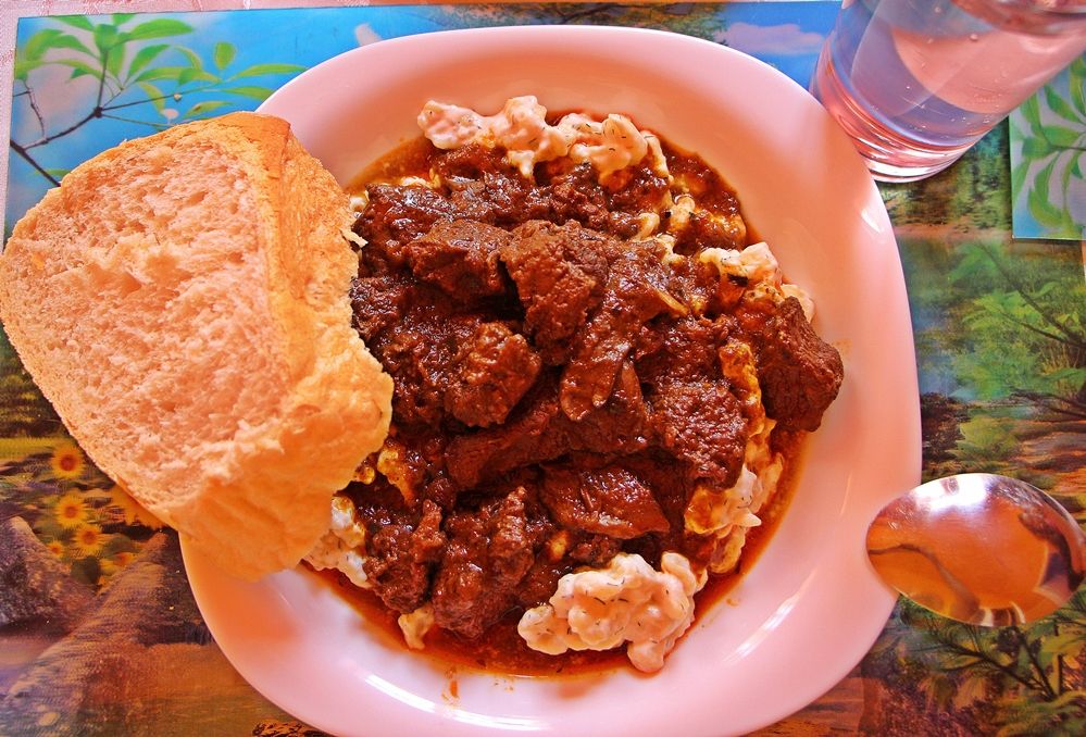 Elkészítés: Felkockázzuk a szarvashúst, a hagymát és a tv paprikát is. A hagymát elkezdjük dinsztelni a kacsazsíron, majd hozzádobjuk a paprikát és a felszeletelt gombát. Ha átpárolódott, beledobjuk a bográcsba a húst és együtt rotyogtatjuk őket. Közben mozsárban összetörjük a fűszereket (kivéve a babért). Ha a hús „kifehéredett" megszórjuk az összezúzott fűszerekkel, a babérral és a pirospaprikával és belenyomjuk a fokhagymát. Hozzáadjuk az áfonyalekvárt, és ha kell még, felöntjük kevés vízzel. 3-4 órán át csak főzzük. Mikor már majdnem puha a hús, beleöntjük a vörösbort, és azzal készre pároljuk. Köretként ezúttal kapros-tejfölös nokedlit készítettem hozzá.