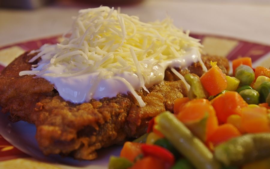 Elkészítés: A vékony hússzeleteket kiklopfoljuk, sózzuk, borsozzuk. A burgonyát megpucoljuk, lereszeljük a kisebbik reszelőn. Besózzuk, és hagyjuk, hogy levet eresszen. Kinyomkodjuk, borsozzuk, majd hozzáadjuk a fokhagymát és a tojást, végül a lisztet. Összekeverjük. Először lisztbe, majd a masszába forgatjuk a hússzeleteket. Lassan szép pirosra sütjük. Ha kész, a tetejére tejföllel kevert fokhagymát teszünk, végül rászórjuk a reszelt sajtot. Rizzsel, burgonyapürével vagy párolt zöldségekkel tálaljuk.