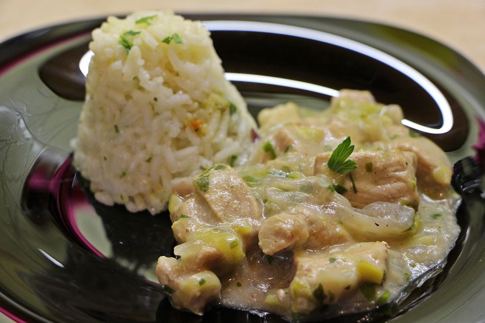 Elkészítés: A húst felkockázom és egy serpenyőben, tetszőleges zsiradékon lepirítom, majd mikor már kifehéredik, hozzá adom a sót, borsot, a mustárt és a mézet és alaposan összeforgatom. A felkarikázott póréhagyma és a félkarikára vágott lila- és vöröshagymák felét a húshoz adom, megszórom a chili paprikával, felöntöm a borral és a vízzel és közepes lángon megpárolom. Ha a folyadék hamarabb elpárologna, minthogy a hús megpuhul, akkor apránként utána pótolom, de ne öntsünk rá sokat, ne ússzon a lében. Amikor a hús megpuhult hozzákeverem a keményítőt, kiforralom, majd mehet bele a maradék hagyma, összeforgatom és azonnal tálalom. Párolt rizzsel, hasábburgonyával, quinoával kínálom.