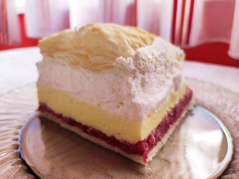 Elkészítés: Az egyik leveles tésztát formára (25x35 cm-es re) nyújtjuk, majd egy tepsi hátán aranyszínűre sütjük pár perc alatt, kb. 180°C-on. A másikat is kinyújtjuk, négyzetekre vágjuk, úgy sütjük meg. A meggyes krémhez a meggybefőtt levében a 8 evőkanál búzadarát 3 evőkanál cukorral megfőzzük. A meggyet apróra vágjuk, és a megfőzött krémbe keverjük. Ez a krém (még langyosan) kerül az alsó lapra. A vaníliás krémhez 2 csomag vaníliás pudingport, 3 evőkanál cukorral, 8 dl tejjel megfőzzük, majd ha kihűlt, hozzáadunk 25 dkg margarint, s tovább verjük habosra. Ez a krém kerül a meggyes krémre. 0,5 liter habtejszínt felverünk jó keményre, majd óvatosan rásimítjuk a vaníliás krémre. A tetejét kirakjuk a négyzetekre vágott lapokkal. Hűtőben pihentetjük. Másnap az igazi, akkora szépen összeáll, könnyebben szeletelhető. Tálaláskor porcukorral megszórjuk.