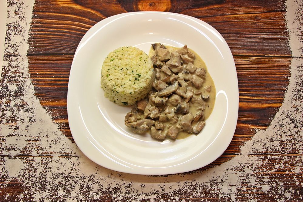 Elkészítés: A pulykamellet felkockázzuk és sózzuk, borsozzuk. Az olajban megfuttatjuk az apróra kockázott vöröshagymát, majd beletesszük a húst, később pedig a gombát. Ha kell, ismét jöhet a só, a bors és addig pároljuk, amíg összeesik a gomba. Felöntjük az alaplével (vagy vízzel) és a tejszínnel. Amikor újra felforrt, a lisztet pici vízzel elkeverjük, és besűrítjük a mártást. Alacsony hőmérsékleten, pár perc alatt készre főzzük. Petrezselymes rizzsel tálaljuk.