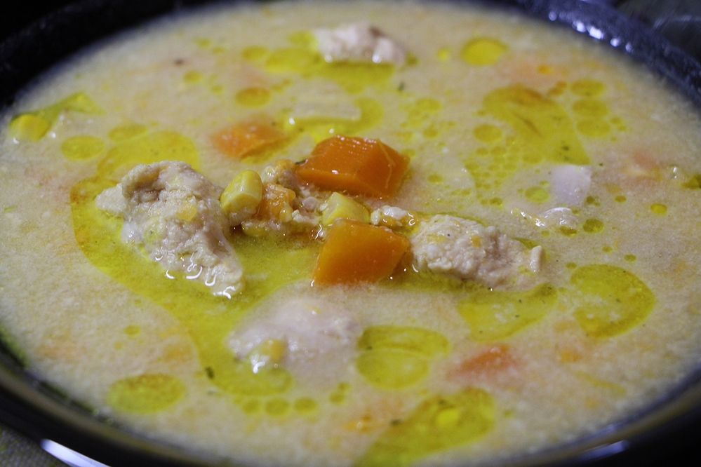 Elkészítés: A felkockázott vöröshagymát és a húst kevés olajon fehéredésig pirítjuk. Hozzáadjuk a zúzott fokhagymát, azt is megfuttatjuk, majd beletesszük a kockára vágott sárgarépát és édesburgonyát. Fűszerezzük, majd felöntjük kb. 2 l vízzel. Puhára pároljuk. A főzőtejszínt simára keverjük a liszttel, majd a levesből - fokozatosan - kb. 1 merőkanálnyit is hozzákeverünk, végül az egészet beleöntjük a fazékba. Beletesszük a konzerv csemegekukoricát is és még kb. 4-5 percig főzzük. Ízlés szerint, tálaláskor pár csepp citromlevet is csepegtethetünk bele.